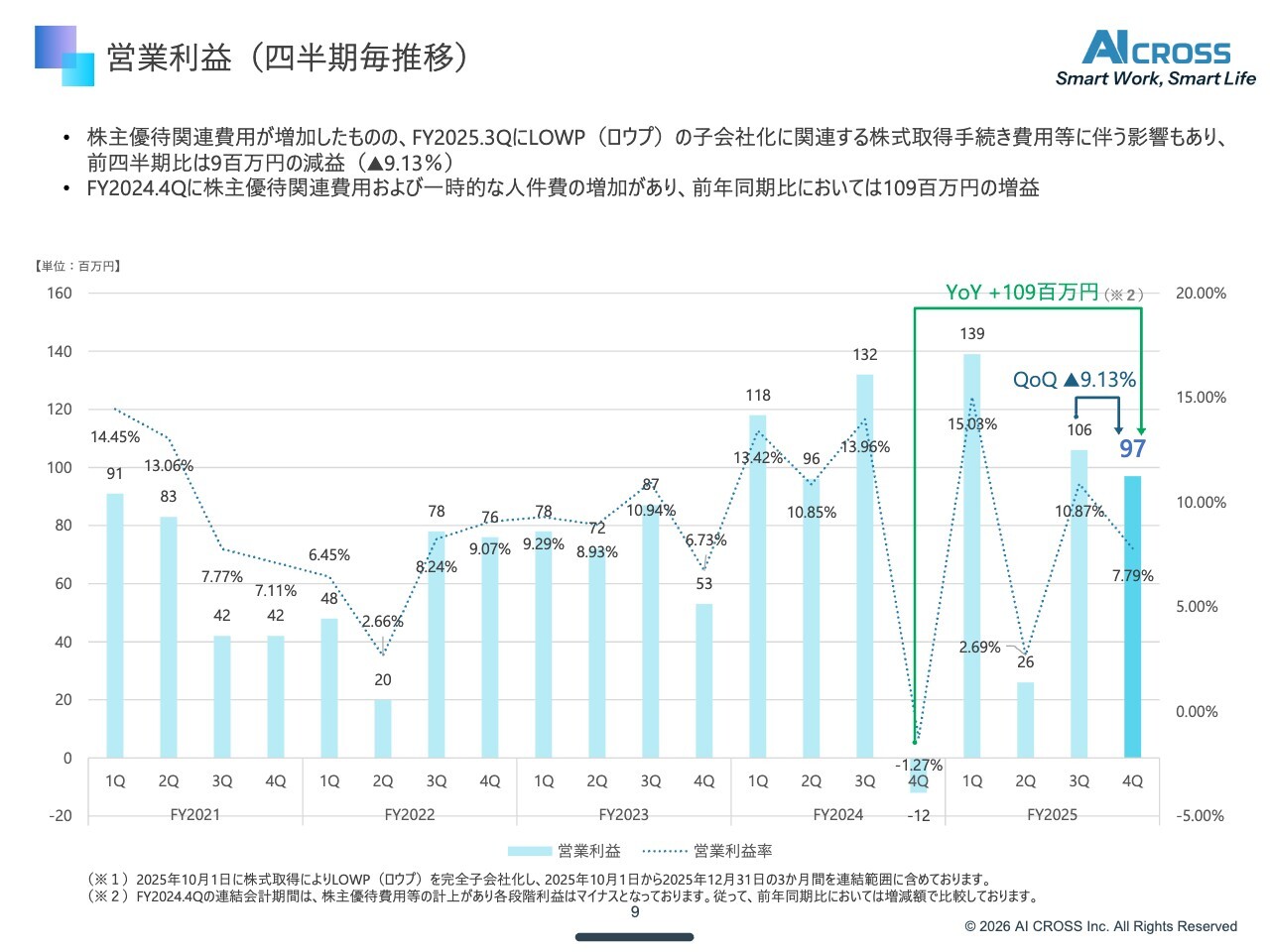 また、ロウプ社のM&A仲介手数料が発生しているため、第3四半期と比べて減益となっていますが、これは一過性のコストです。