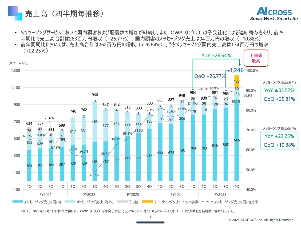 原田:昨年10月に当社は株式会社ロウプを連結子会社化しました。2025年第4四半期からロウプ社の業績も織り込んでいます。ロウプ社の買収は、メッセージング事業の多角化や、ARPU(1ユーザーあたりの平均収益)の向上を目的にしています。