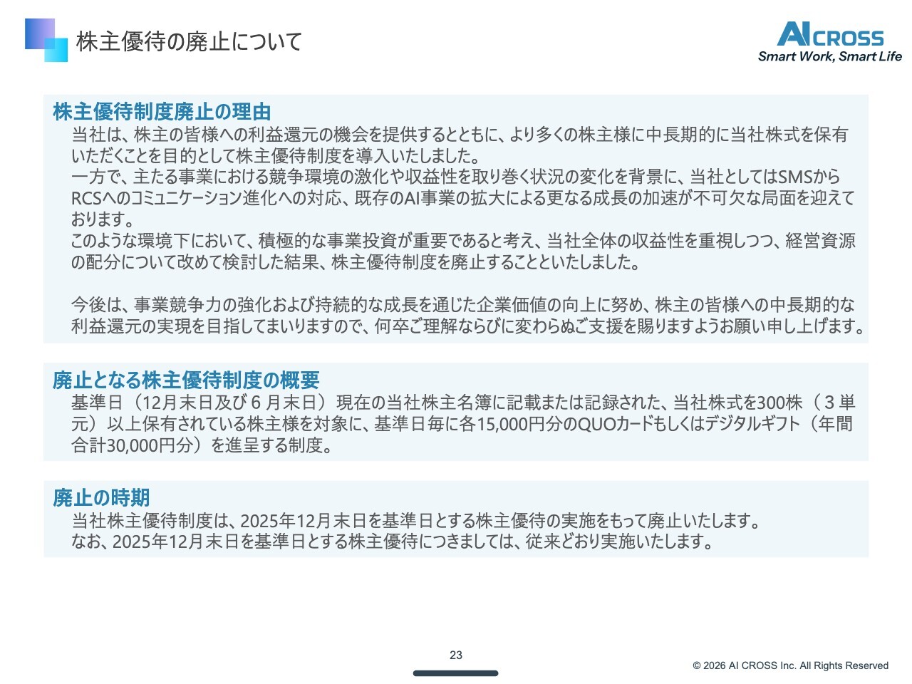 このスピードにしっかりと対応するため、当社としては事業への投資を行い、企業価値の向上に努めることで、株主のみなさまへの中長期的な利益還元の実現を目指していきたいと考えます。この決断を下すにあたり、現在が最善の時期であると判断しました。そのため、2025年12月末日を基準日とする株主優待の実施をもって廃止することとしました。