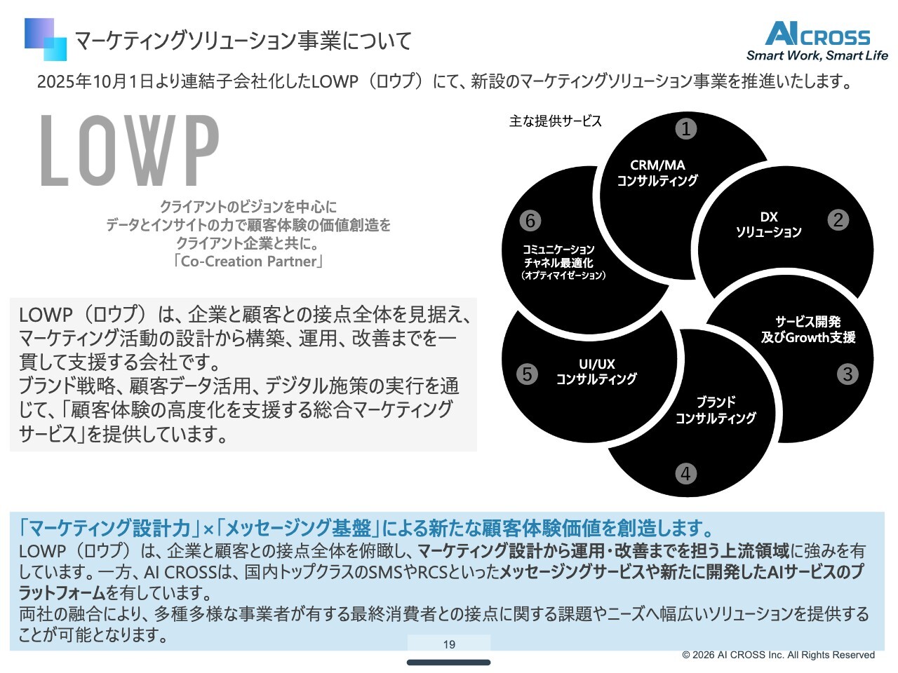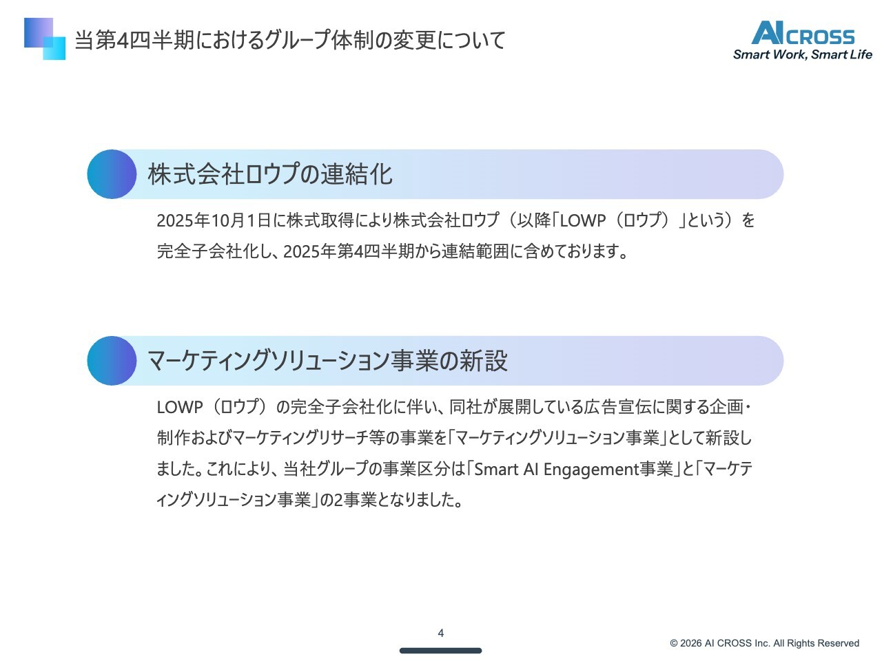 また、これに伴い、マーケティングソリューション事業を新設しました。これまで当社はSmart AI Engagement事業として単一セグメントで開示していましたが、マーケティングソリューション事業を加えることで、私たちのソリューション全体にさらに厚みを持たせる狙いがあります。