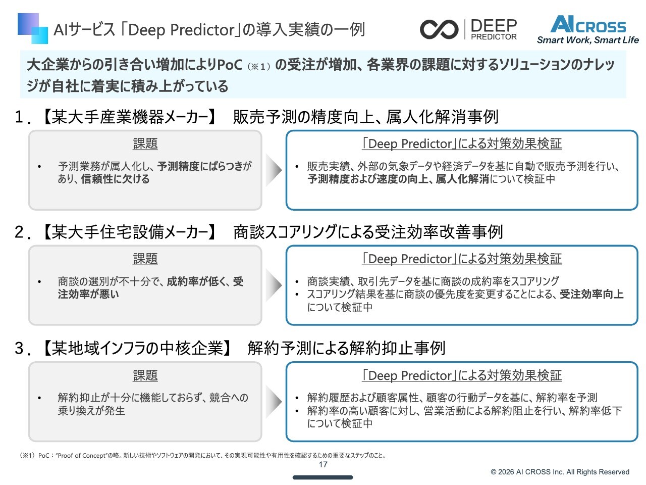 原田:スライドは「Deep Predictor」の導入事例の一例です。精度検証やオペレーション検証といったさまざまなPoCの受注が増加しています。これまでも多くご紹介してきましたが、大手メーカーの需要予測において、製造業を中心にPoCの受注が積み上がってきています。