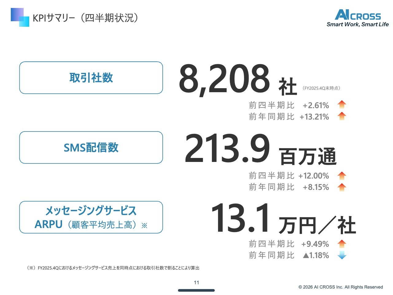 SMS配信数は約2億1,300万通で、前四半期比で10パーセント以上の成長を記録しました。SMSの市場は国内のお客さまを中心に依然として成長市場です。市場リポートである「ミックITリポート」において、今後4年から5年にわたり、15パーセントから20パーセントの成長が見込まれています。