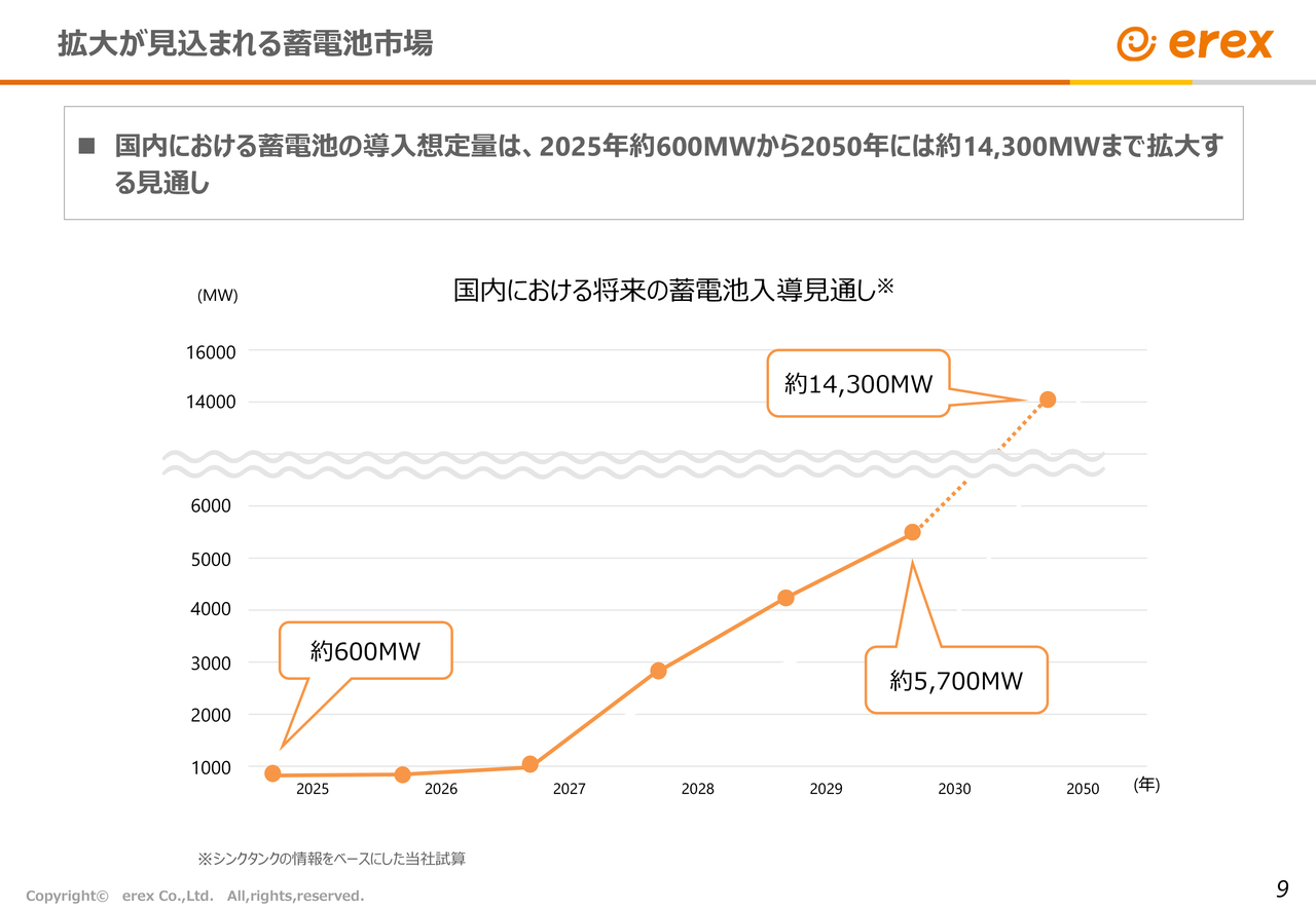 スライドのグラフは、国内における蓄電池の導入想定量を示しています。2023年時点では約600メガワットですが、2050年には約1万4,300メガワットまで拡大する見通しです。