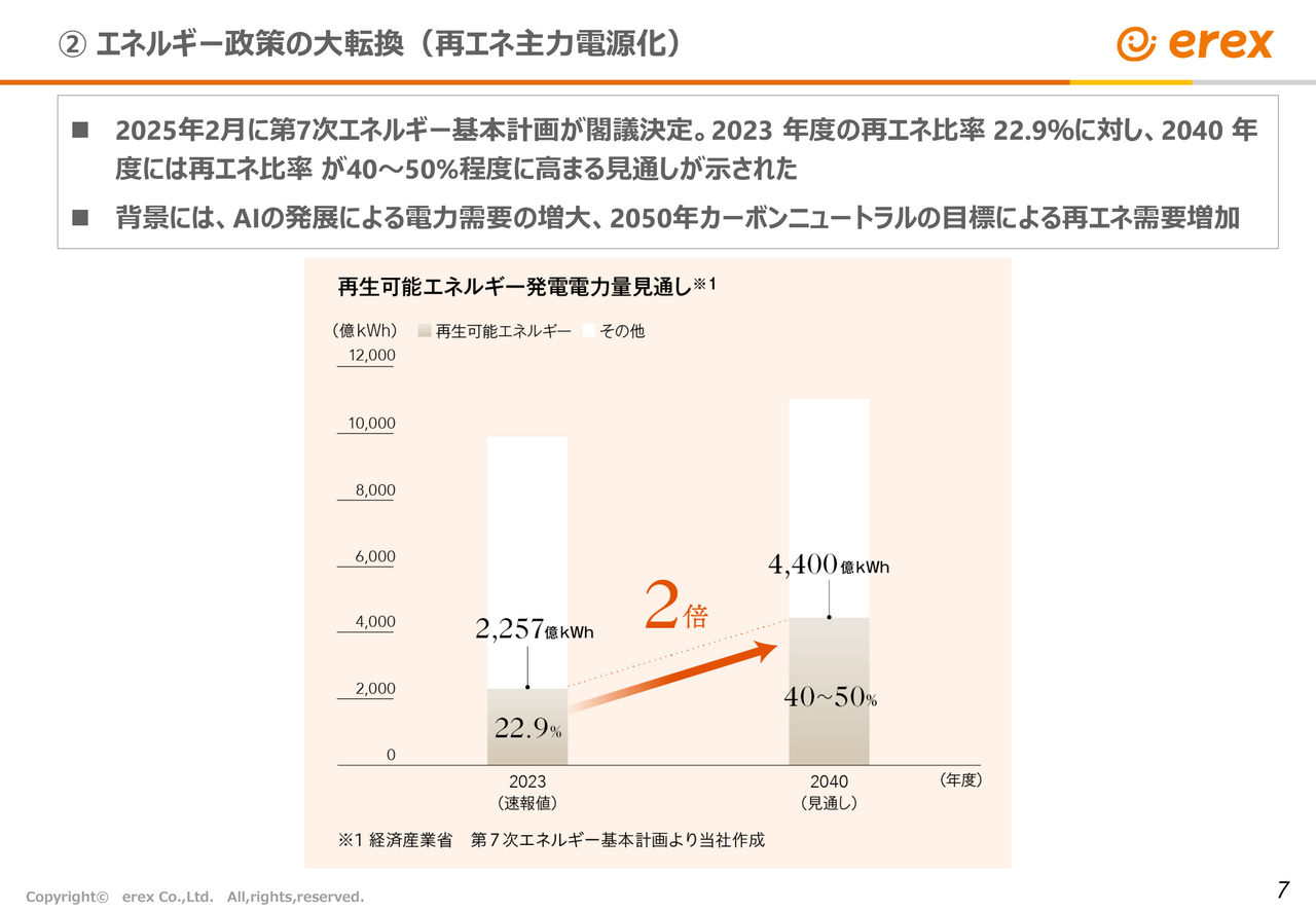 田中:一方で、エネルギー政策の大転換が進んでいます。昨年2月に「第7次エネルギー基本計画」が閣議決定されました。2023年度には22.9パーセントだった再生可能エネルギー比率を、2040年までに40パーセントから50パーセントに引き上げる見通しが示されています。