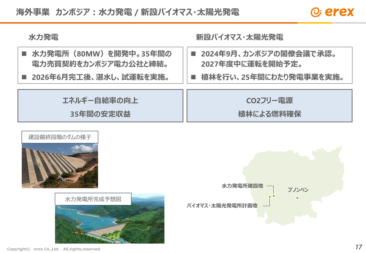 一方、東南アジアのカンボジアでは水力発電所を1基建設中であり、さらにバイオマス発電所と太陽光発電所をそれぞれ1基ずつ建設しています。