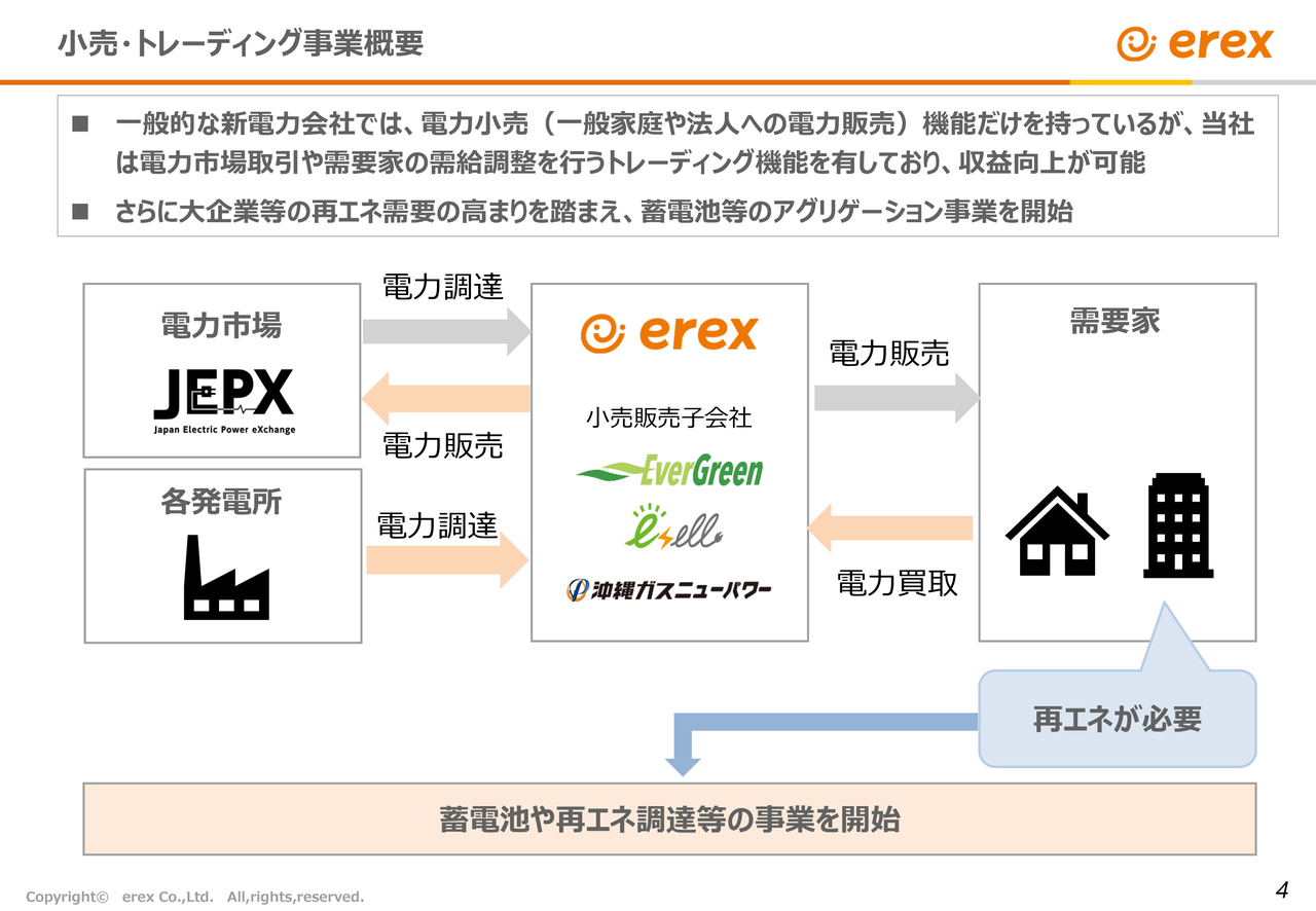 田中:各事業の詳細をご説明します。まず小売・トレーディング事業についてです。当社は俗に「新電力」と呼ばれる会社のひとつであり、電力小売事業を行っています。
