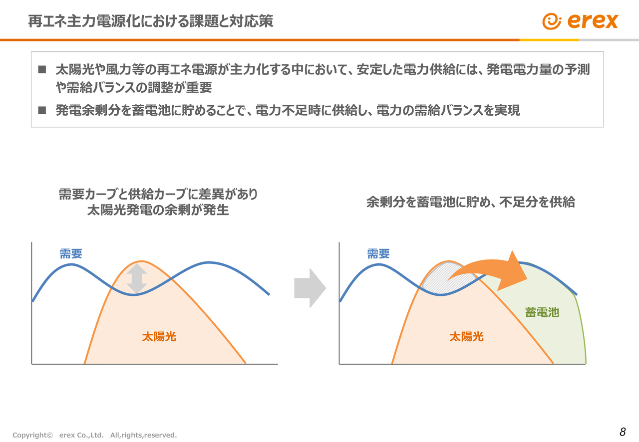 具体的な取り組み案件として、スライド下部に記載の「系統用蓄電池」のほか、「太陽光併設蓄電池」があります。現在すでに稼働している太陽光発電所において、出力抑制(注)というかたちで発電が制限される状況が発生します。特にこれから春先に向けてそのような状況が増加すると予想されています。