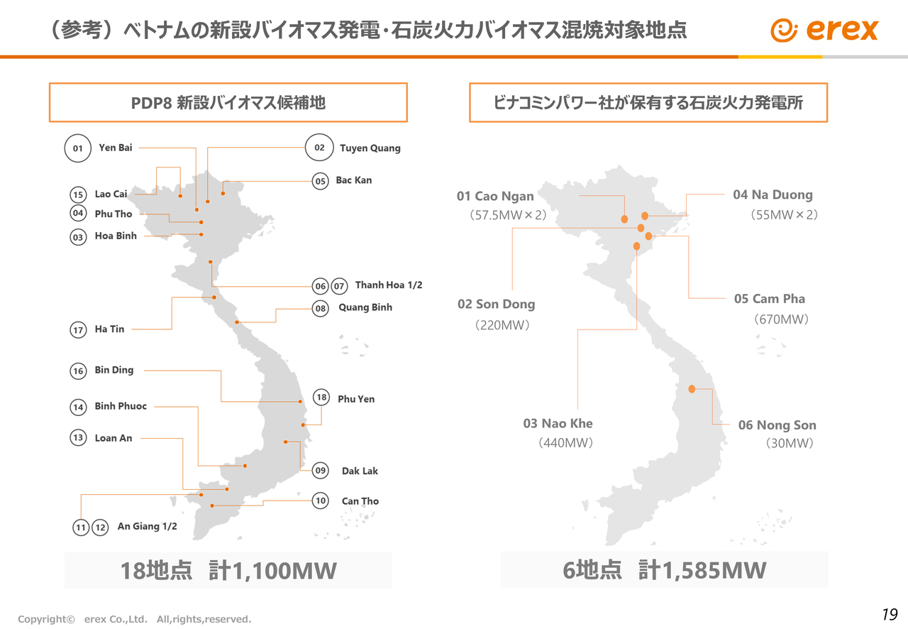 田中:スライドは、今後当社がベトナムで新設するバイオマス発電所の候補地です。スライド左側がベトナム政府のPDP8における候補予定地で、現在18ヶ所が挙げられています。