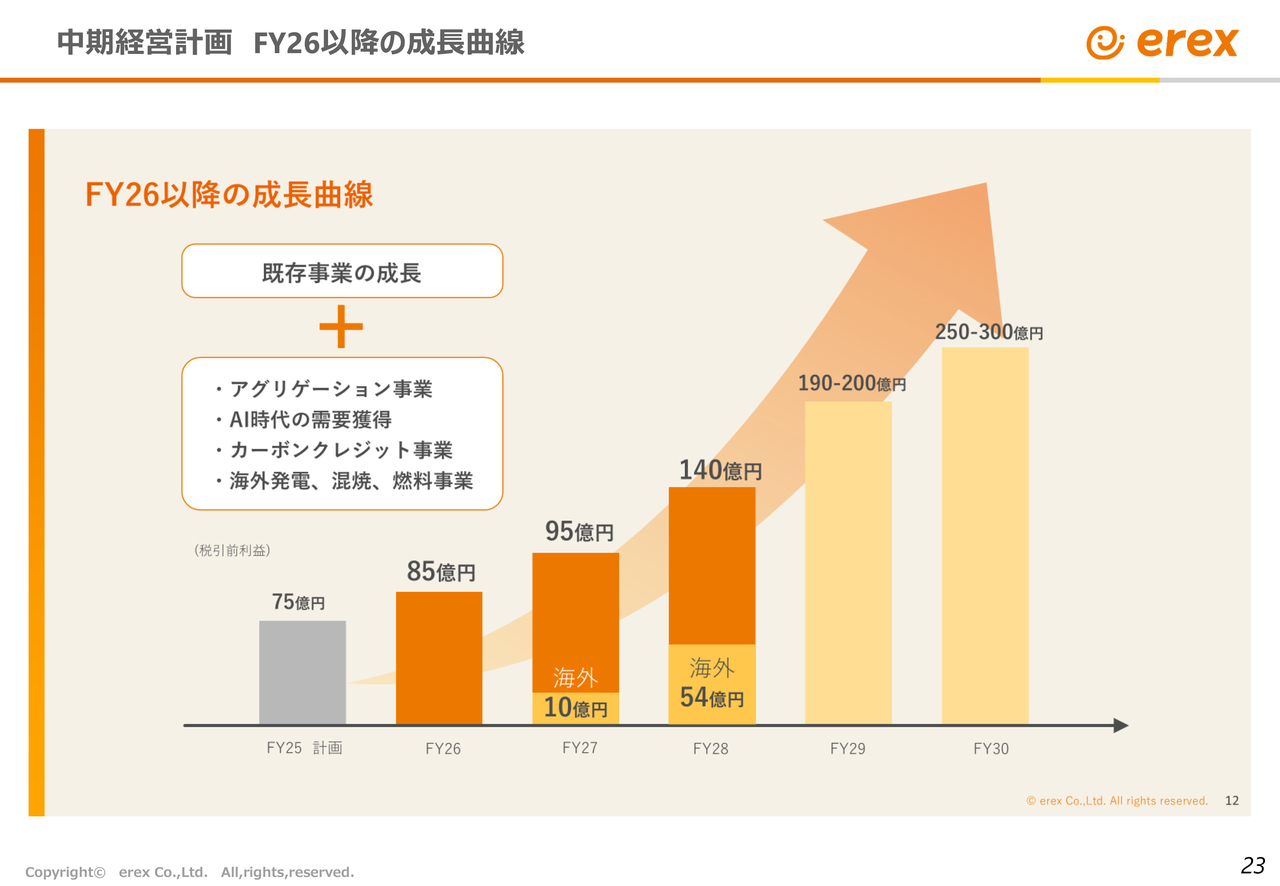 また、カーボンクレジット事業や海外での発電、混焼、燃料事業を通じて、2029年度以降はおおよそ190億円から200億円、2030年度には250億円から300億円といった税引前利益の獲得が可能であると考えています。