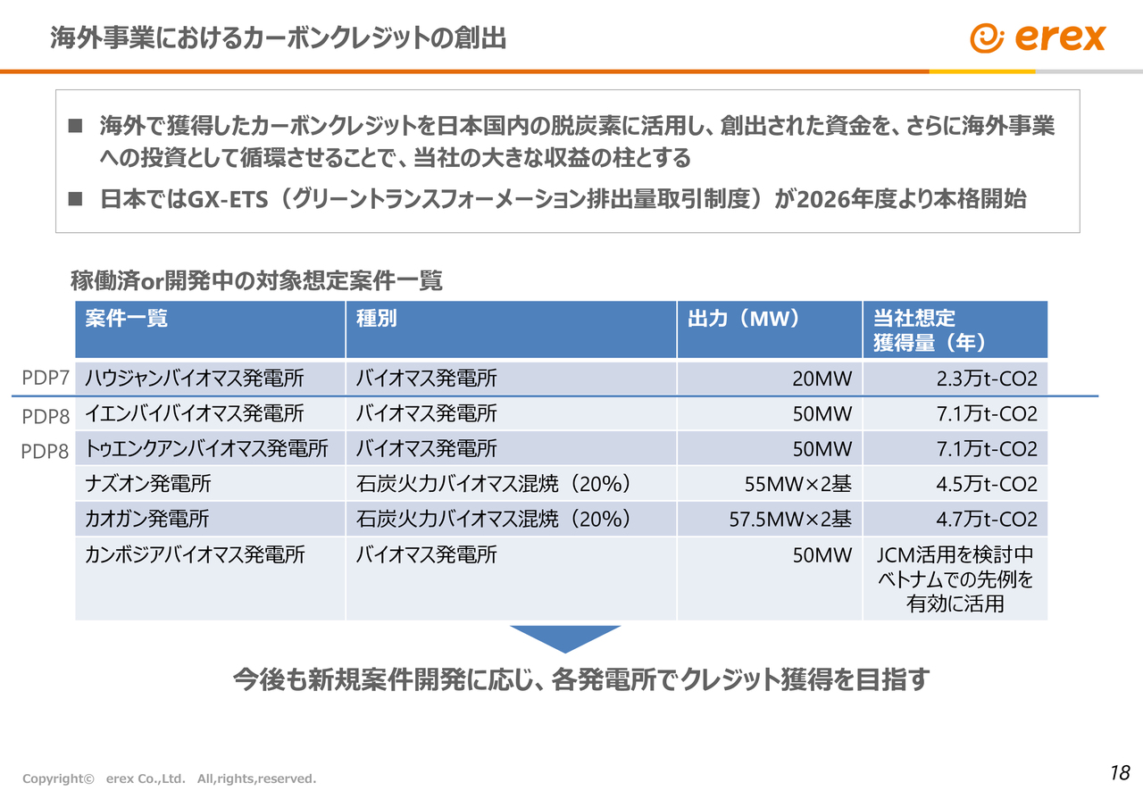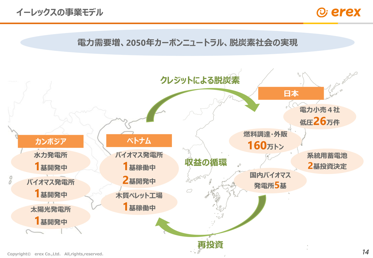 直近でご説明しました海外でのカーボンクレジットを活用し、このクレジットによる脱炭素を日本で推進する方針です。また、日本で得られた利益を海外で再投資することで、イーレックスの事業モデルは循環していくとお考えいただければと思います。