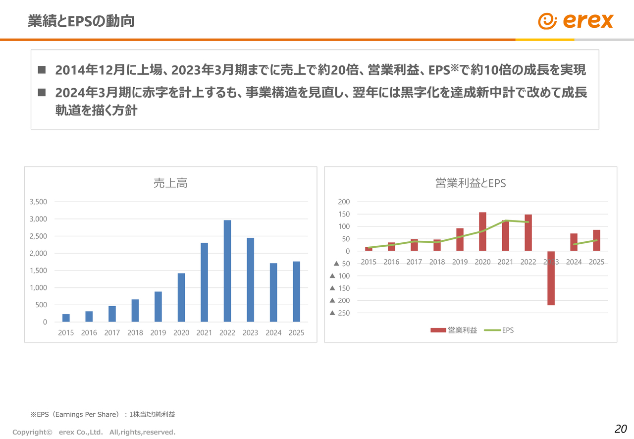 田中:当社の業績とEPS動向についてです。当社は2014年12月に上場し、2023年3月期までに売上高で約20倍、営業利益などで約10倍の成長を達成しました。