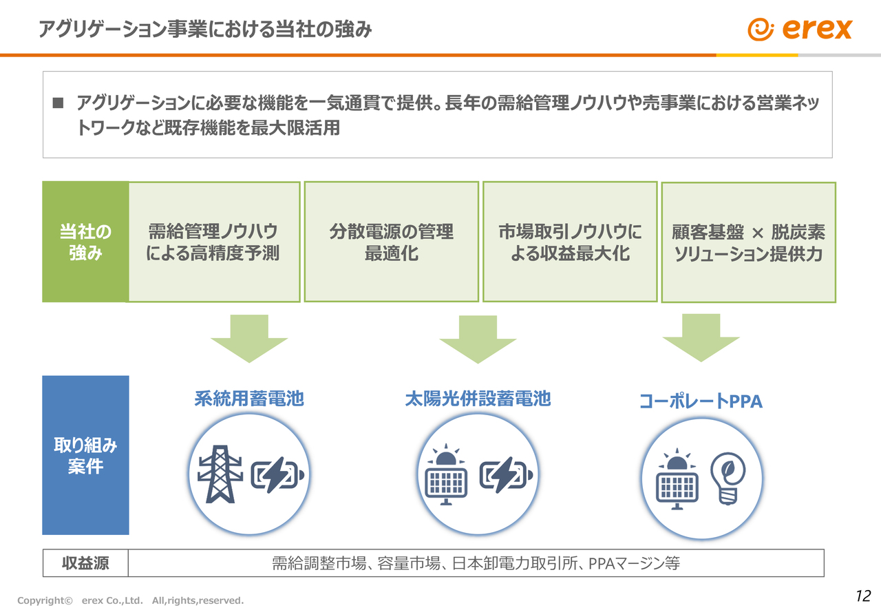 それ以外にも「需給管理ノウハウによる高精度の予測」「分散電源の管理の最適化」、さらに「市場取引ノウハウによる収益の最大化」、そして小売事業である「顧客基盤×脱炭素ソリューションの提供」が強みとなっています。