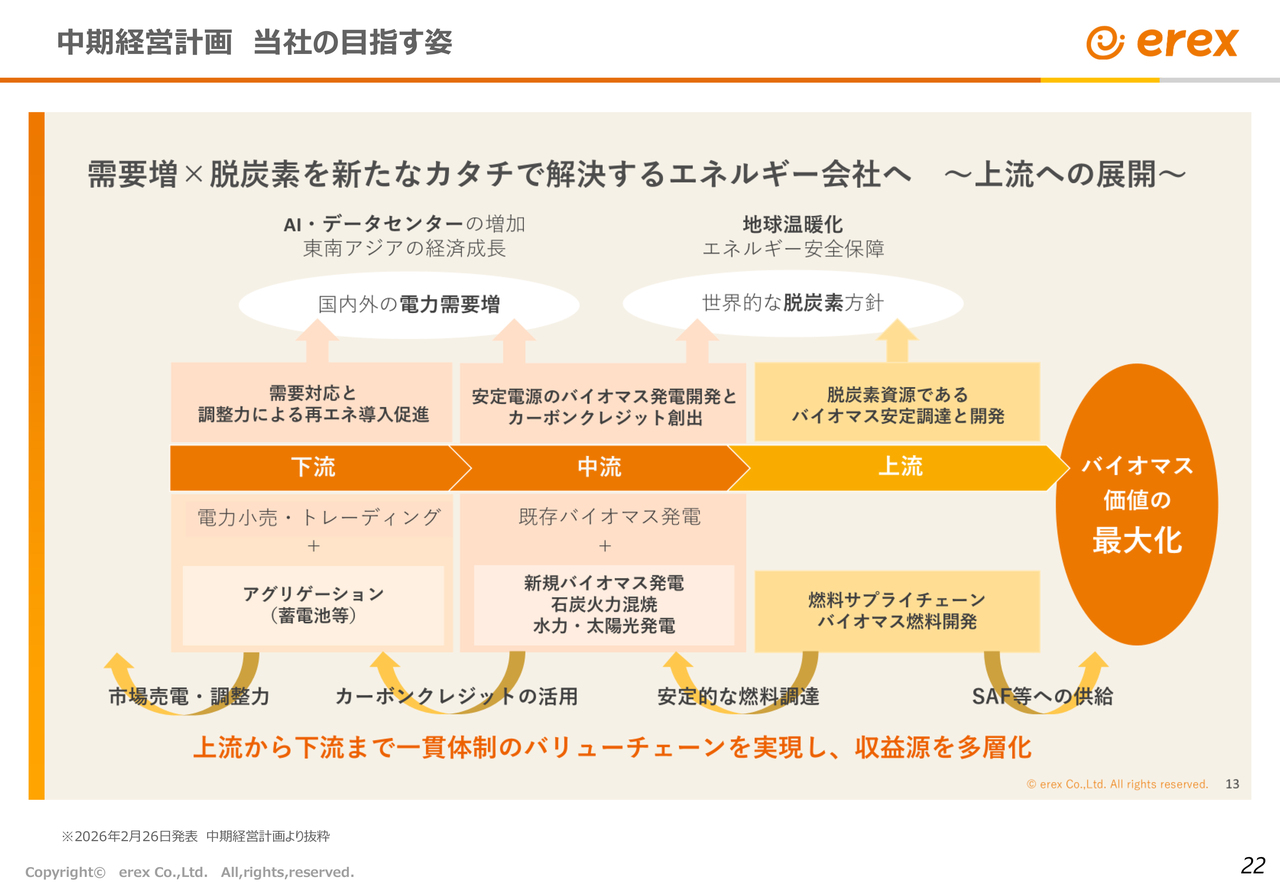 当社としては、スライドに記載のとおり、これまでは下流・中流に対応してきました。これから先は、スライド右側に示す上流、特に新たなバイオマス燃料を含む燃料のサプライチェーンが非常に重要になります。この領域は、今後も着実に推進していかなければならないと考えています。