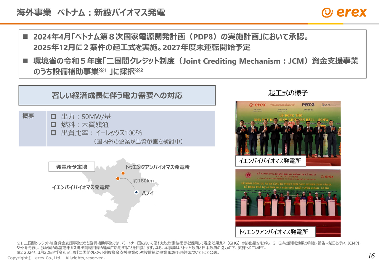 当社は、このトゥエンクアンバイオマス発電所とイエンバイバイオマス発電所への投資を決定しました。この投資決定は、ベトナム政府の「第8次国家電源開発計画(PDP8)の実施計画」の承認を受けており、昨年12月に起工式を行っています。