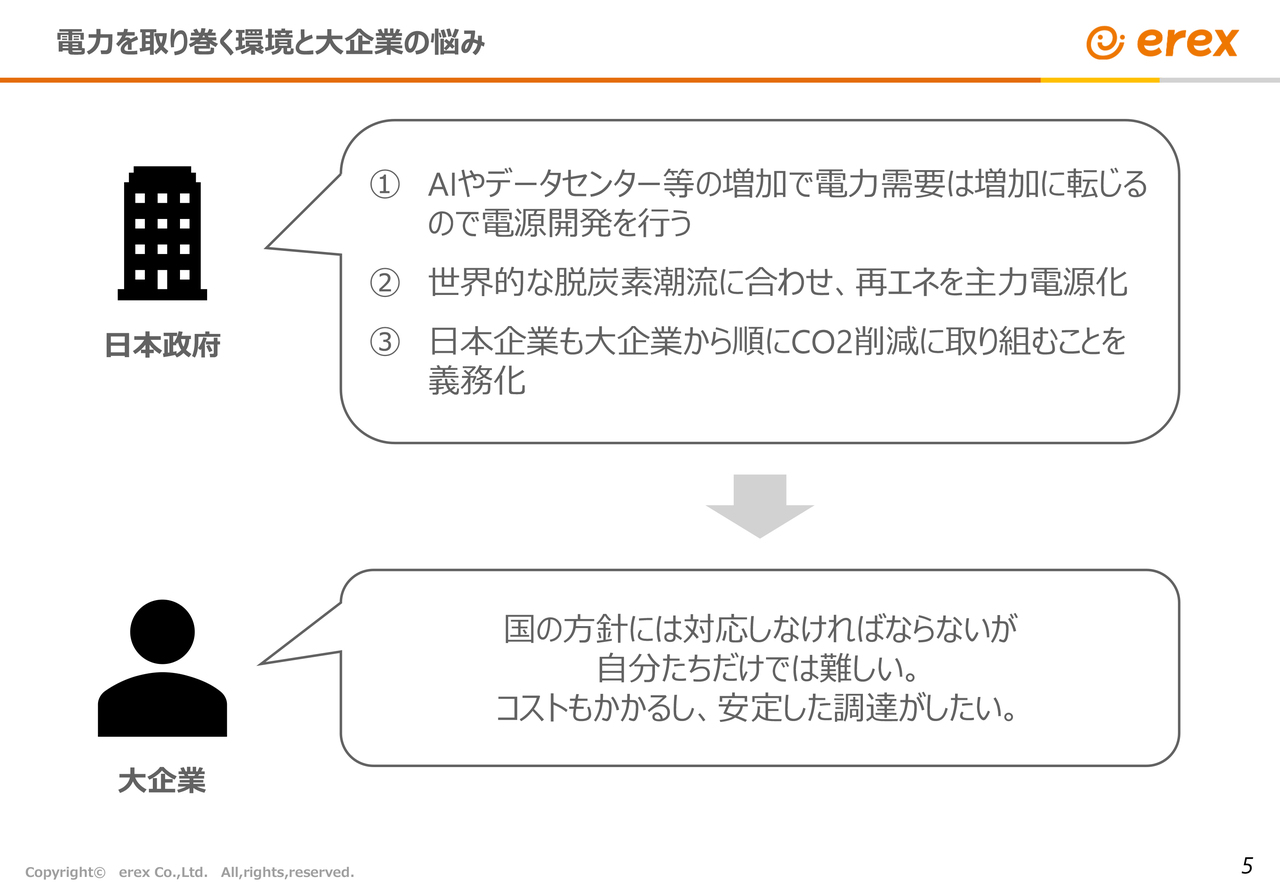 一方、世界的な脱炭素の流れを受けて、日本でも再生可能エネルギーを主力電源化する動きが進んでいます。特に日本企業においては、大企業から順次CO2削減への取り組みが義務化されており、大企業を中心に「国の方針には対応しなければならない中で、自分たちだけではなかなか難しい、コストもかかるし、安定した調達がしたい」という悩みを抱えている状況です。