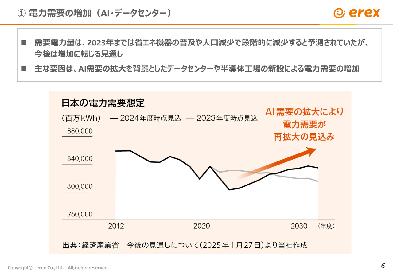 この背景には、AIの発展による電力需要の増大や、カーボンニュートラルの目標に伴う再生可能エネルギー需要の増加があります。