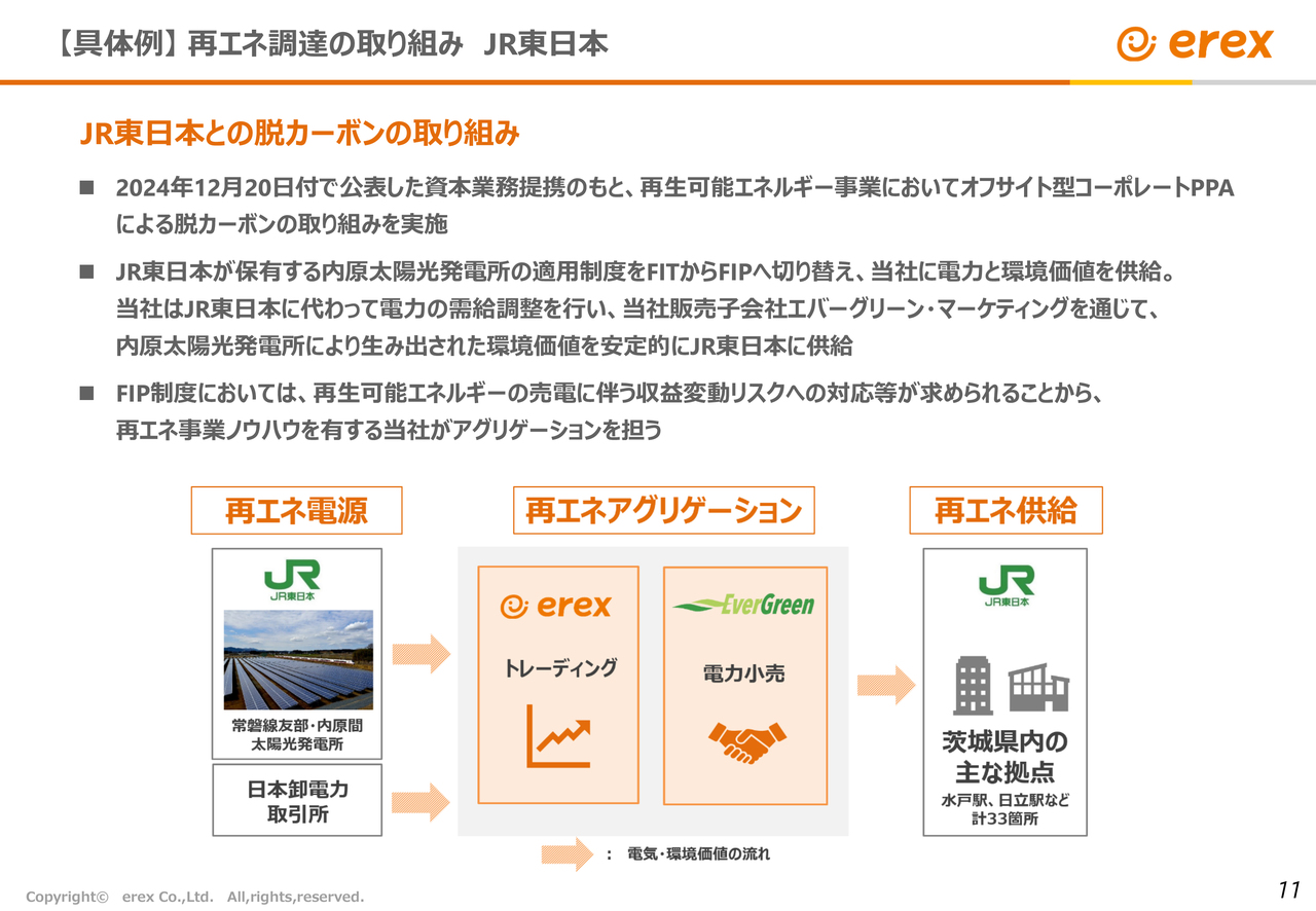 田中:アグリゲーション事業の具体例についてご説明します。東日本旅客鉄道(以下、JR東日本)と再生可能エネルギーの調達に取り組んでおり、事業を推進しています。