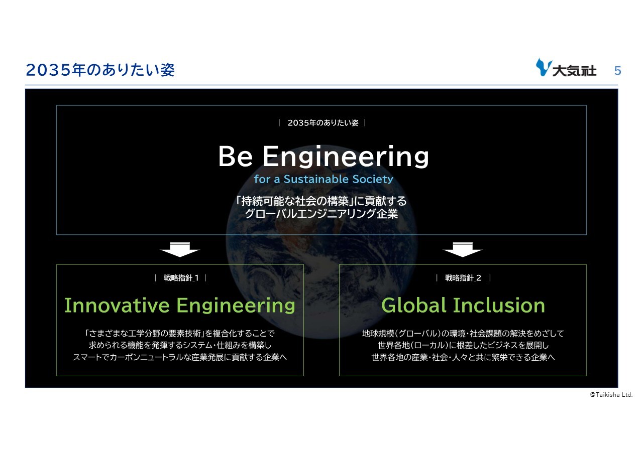 私たちが目指す「ありたい姿」は、“Be Engineering for a Sustainable Society”、すなわち持続可能な社会に貢献するグローバルエンジニアリング企業です。その実現に向けて、GXとDXを融合した“Innovative Engineering”、そして19ヶ国28拠点のネットワークを深化させる“Global Inclusion”、この2つを戦略指針として掲げています。10年プランは、当社が長期視点でどのように変革し、どのように価値を創出していくかを示したものです。長期的な企業価値向上に向けて邁進します。
