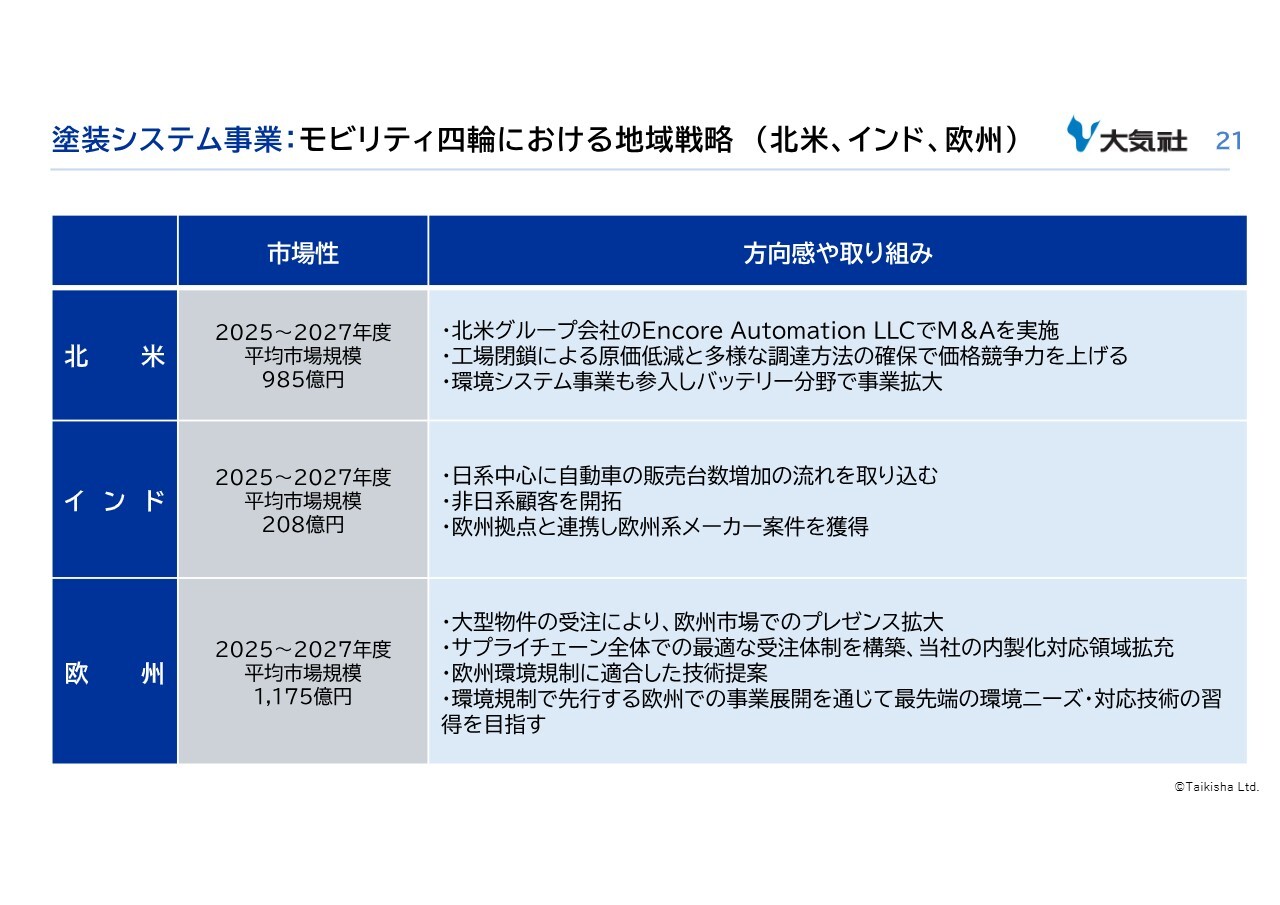 塗装システム事業:モビリティ四輪における地域戦略(北米、インド、欧州)