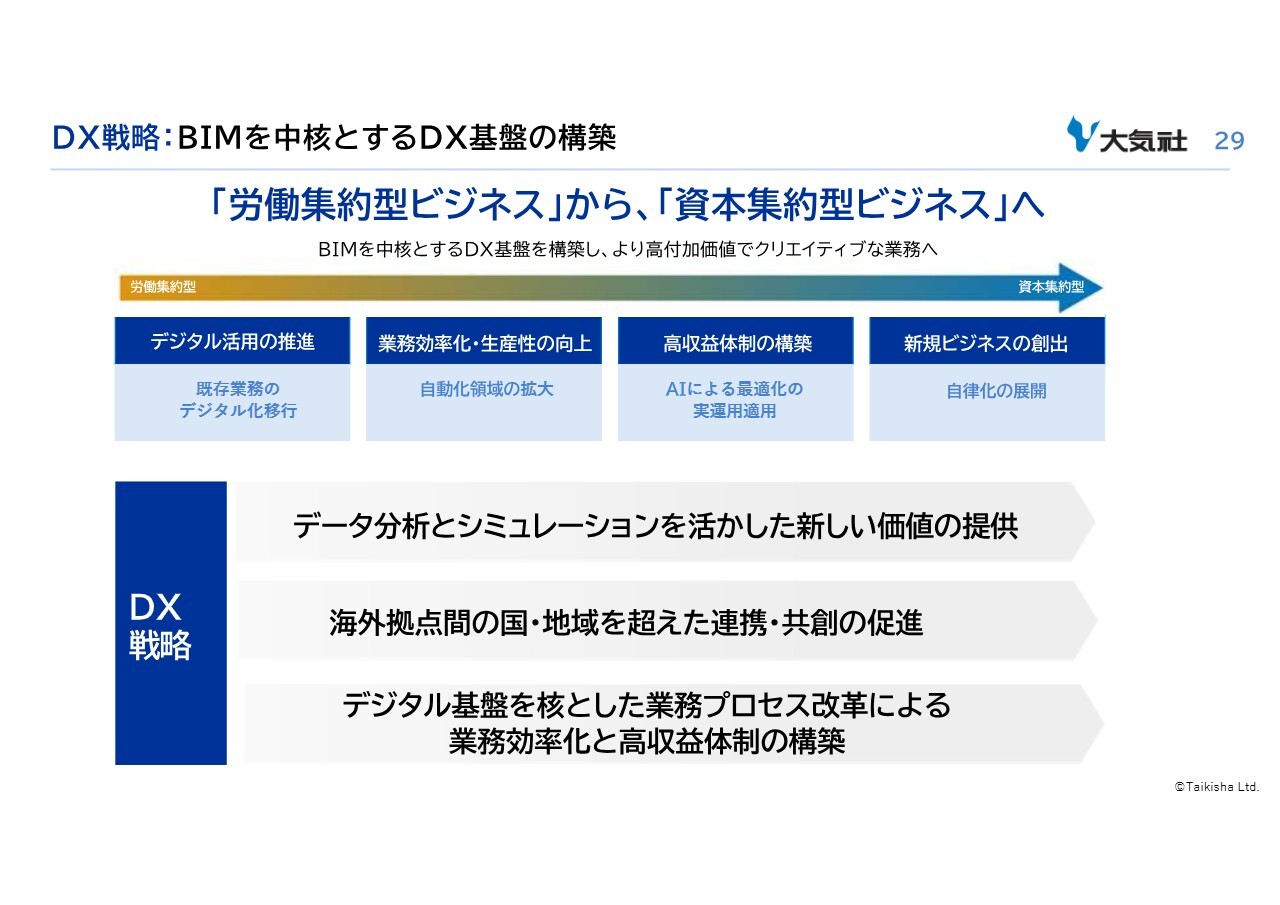 ここからはDX戦略についてご説明します。当社は多くの人手や時間を投入して利益を上げる「労働集約型ビジネス」から、デジタル基盤などへの投資を通じて効率性と収益性を高める「資本集約型ビジネス」への移行を目指しています。このプロセスにおいて重要な要素であるBIMを中心としたDX基盤を構築するため、戦略を策定しました。