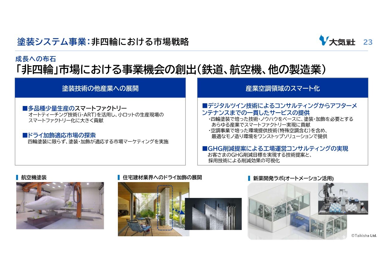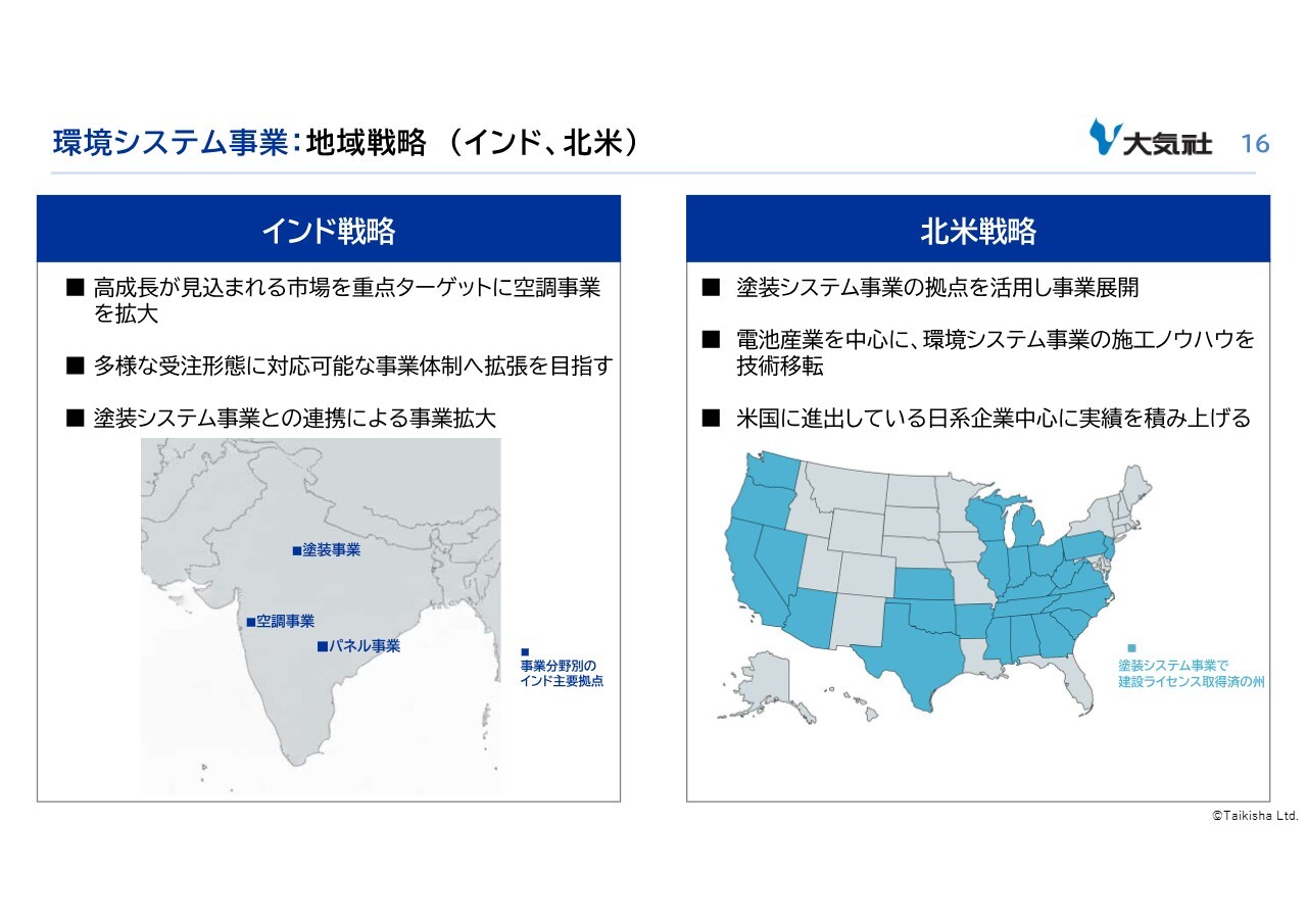 北米戦略室については、先ほどお伝えしたとおり、現時点で環境システム事業としては未知数であり、検討段階です。空調分野の市場は大きいため、今後、塗装システム事業とのシナジーを活かしながら空調分野での市場拡大を目指します。