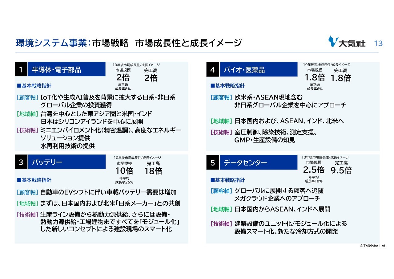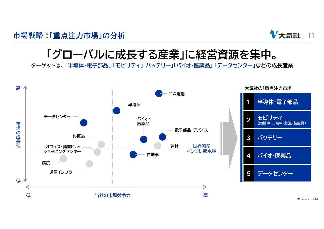 成長産業への積極展開であり、当社として、市場の成長性と当社の市場競争力を勘案し、「半導体・電子部品」、「モビリティ」、「バッテリー」、「バイオ・医薬品」、「データセンター」の5つを重点注力市場に据えました。