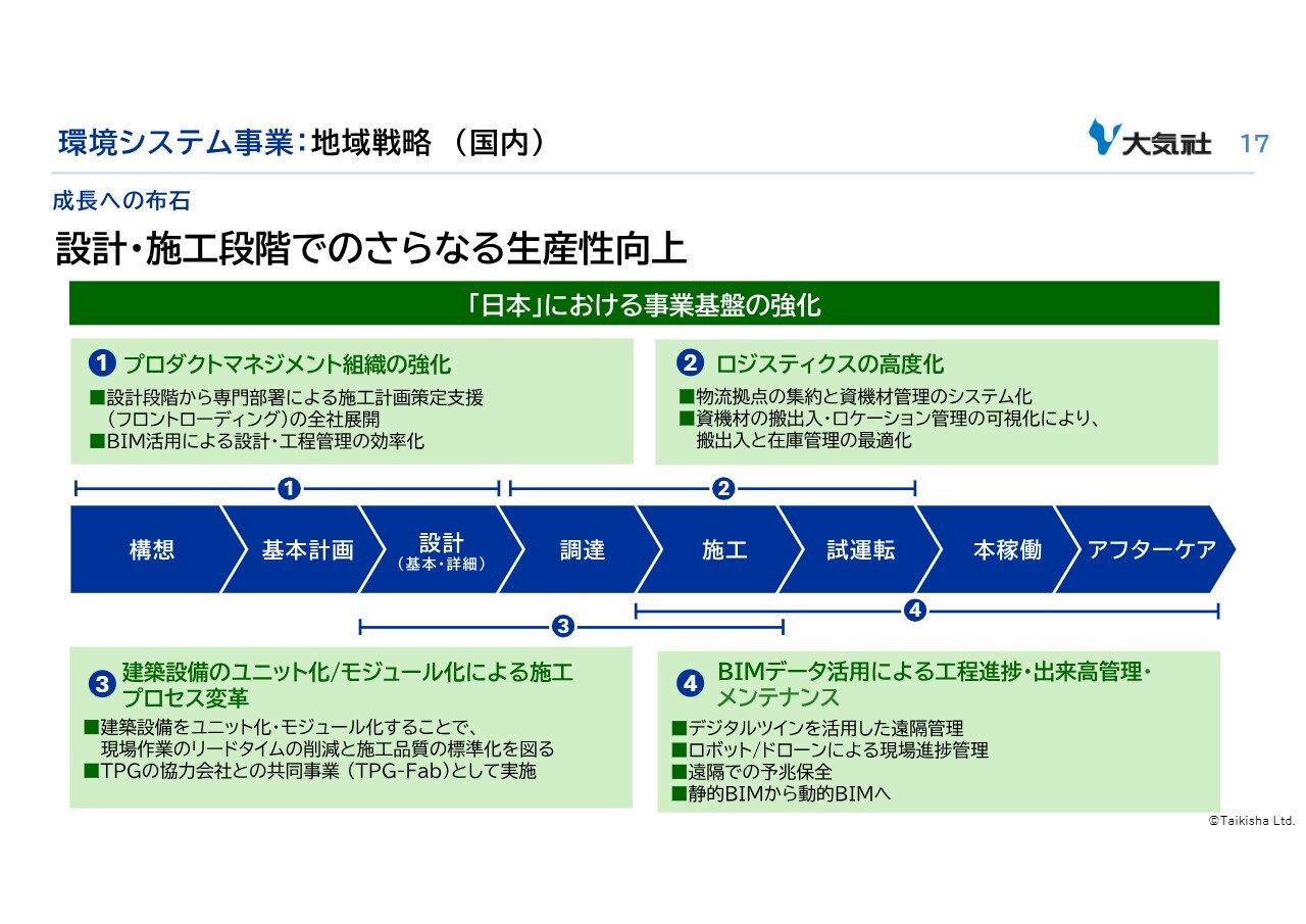 当社の特徴でもある海外事業については、足元では日系企業による設備投資のタイミングを見直す動きも一部見られますが、現地ローカル企業や欧米顧客からの案件が増えてきています。ローカル企業や日系・欧米サブコンとの競争は厳しく、現時点では国内と比較すると採算性の見通しは厳しいですが、国内同様に業務のDX化・設計施工段階での生産性の向上と当社との取引実績を通じて顧客からの信頼を獲得し、特命受注の比率を高めることで採算性の改善を図っていきたいと考えています。