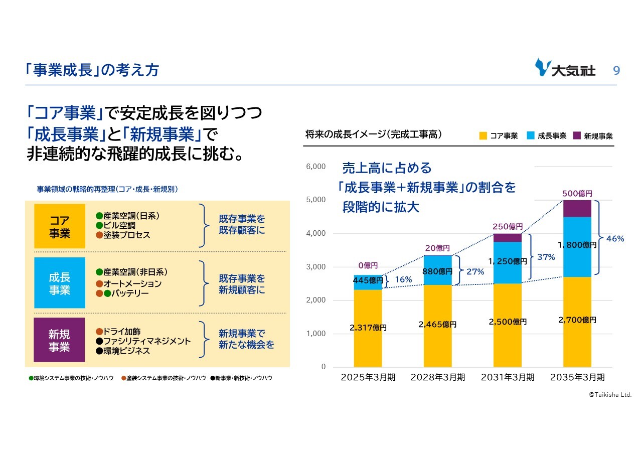 特に、成長事業は、産業空調のうち非日系企業を開拓していく部分と、塗装事業のオートメーション、両事業の技術シナジーで新たな価値を創造する領域で、既存事業の技術・ノウハウを活かし、新たなお客さまへの価値提供を実現します。すでに台湾積体電路製造(TSMC)の日本工場建設プロジェクトへの参画をはじめとした成果を上げており、今後さらに実績を積み重ねながら、グループ全体のチャレンジマインドを高め、拡大を目指します。また、新規事業ではドライ加飾をはじめCO2の回収などさまざまな分野に果敢に挑戦しています。