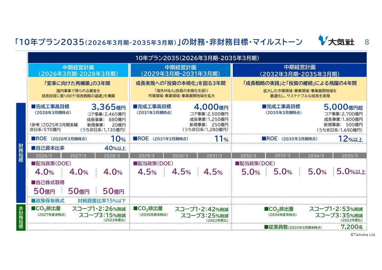 10年後の完成工事高5,000億円は、現在の約2倍です。これは「積み上げ」ではなく、非連続な成長を織り込んだ挑戦的な目標です。従業員数は36パーセント増に抑え、労働集約型事業から資本集約型事業への転換を明確に打ち出しています。ROE12パーセント以上も、事業成長を前提とした高い目標です。DOEは段階的に引き上げ、10年後に5パーセント以上を目指します。