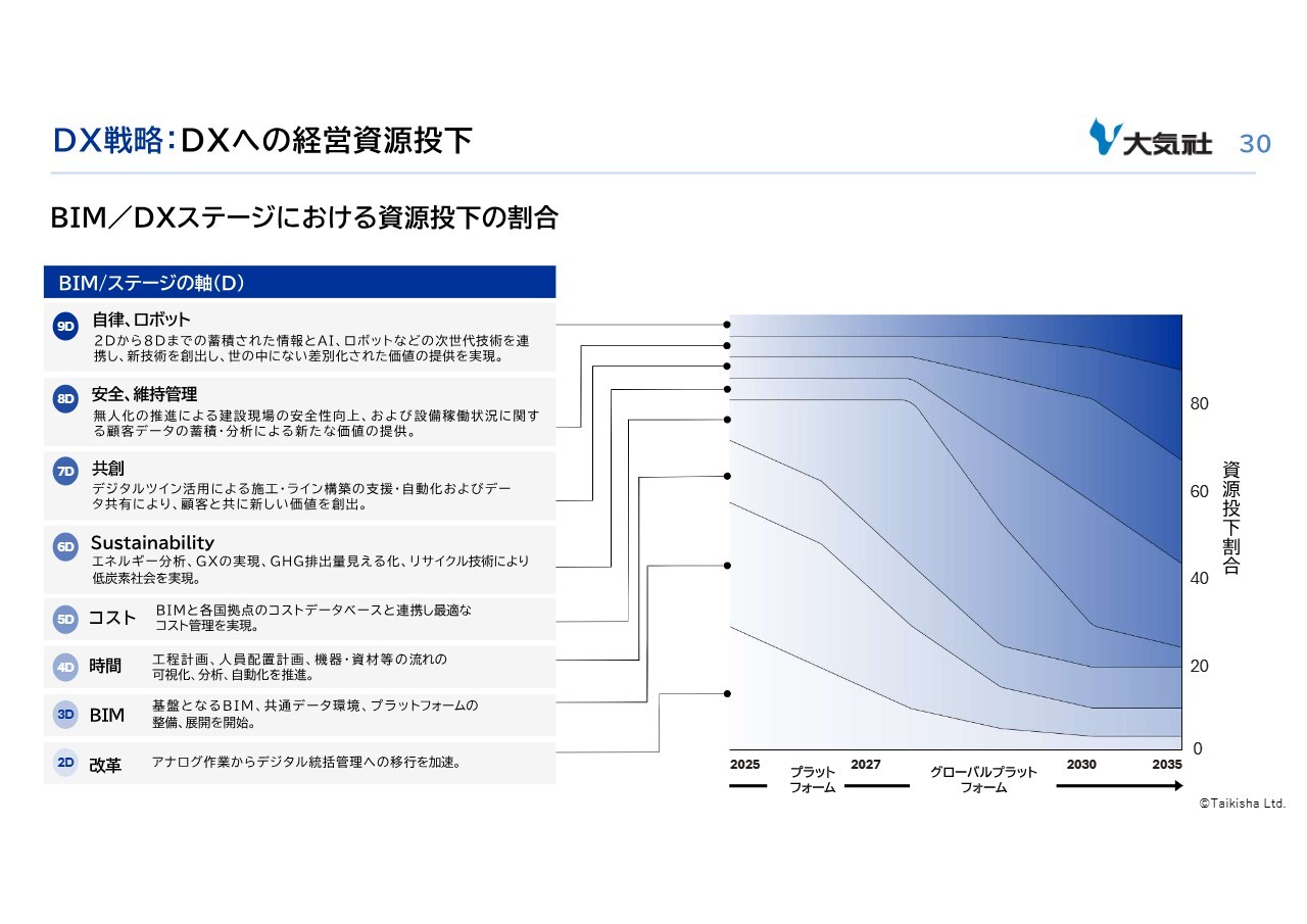 これらの取り組みにあわせ、資源投下の重点も段階的に組み替えていく方針です。まず初期フェーズではBIM基盤の整備や業務デジタル化への投資比率を高め、その後、分析・シミュレーション、共創先端技術活用といった高付加価値領域へと投資の重心を移行させていきます。