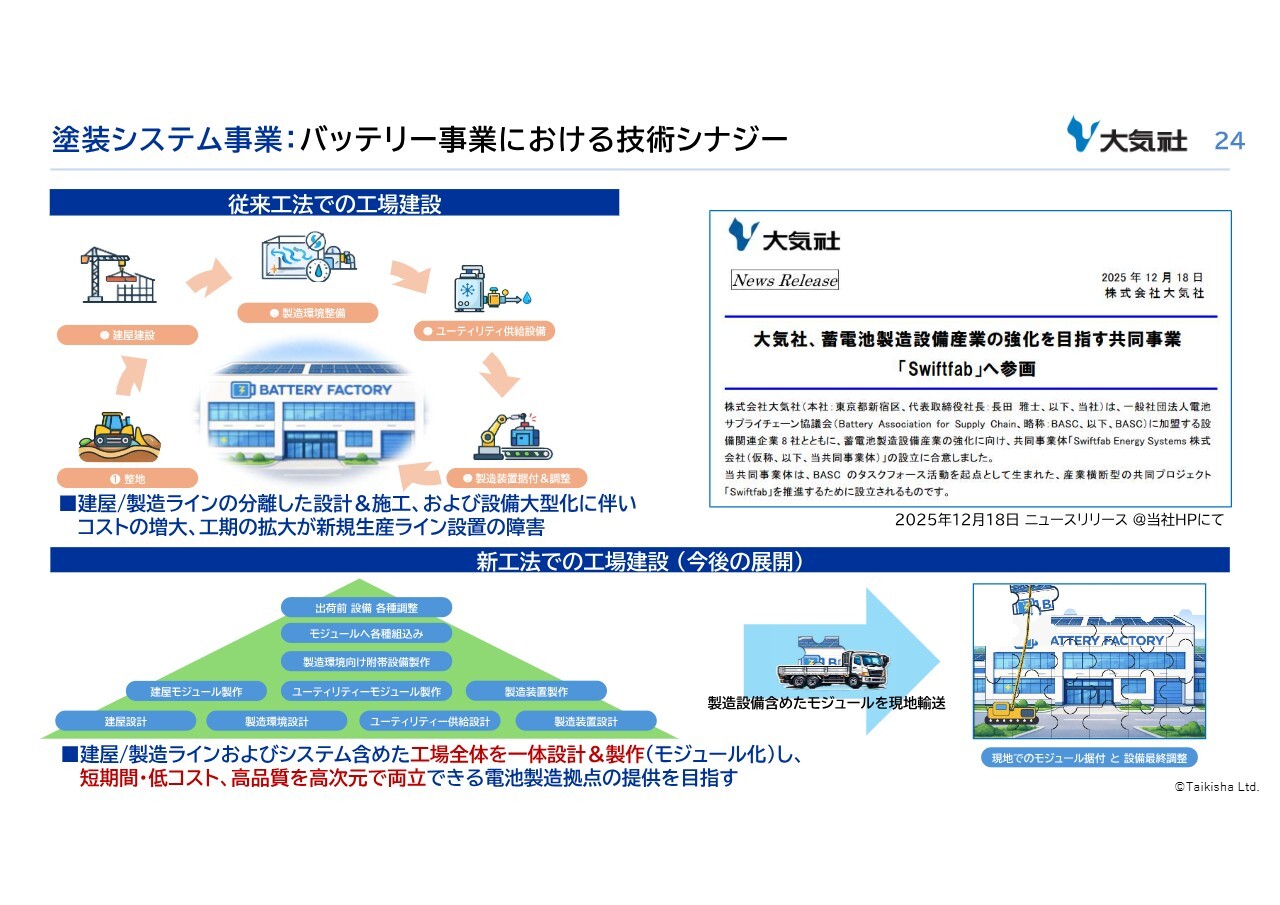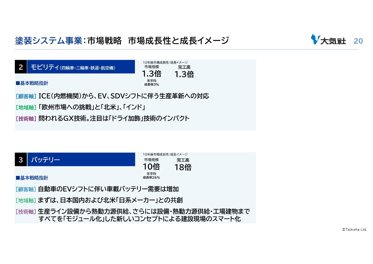次にバッテリー市場です。米国の政策方針の変化により、足元では一時的に市場が低迷していますが、長期的にはモビリティのEVシフトにより市場拡大は続くと見ています。バッテリー製造にはドライルームなど高度な空調環境が不可欠であり、自動車メーカーによる内製化の動きもあることから、塗装システム事業とのシナジーを活かせる分野と考えています。