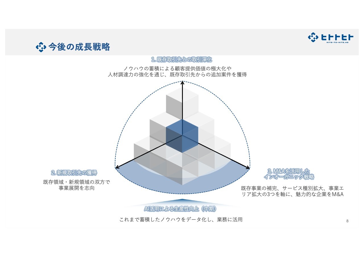 3つ目は「M&Aを活用したインオーガニック戦略」です。これまでに当社は2件のM&Aを成立させており、そのうち1件はインハウスでPMIまで実行しています。M&Aは相手先あってのものであり、ご縁に左右される面もありますが、当社はこの業界を積極的にウォッチしていますので、ご縁があれば取り組みたいと考えています。