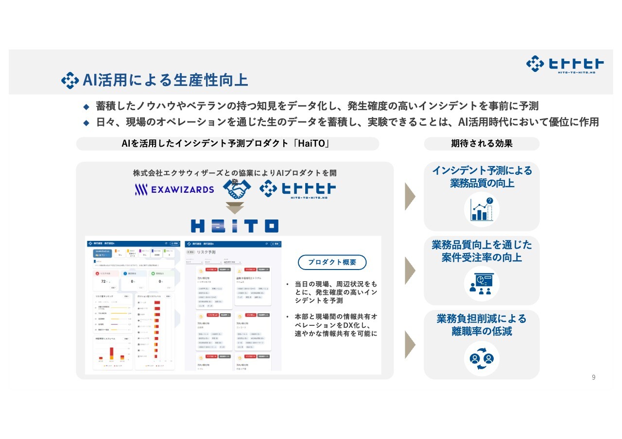 1つ目は、インシデント予測ツールの「HaiTO(ハイト)」です。各現場の特性をデータとしてAIに学習させ、未然にインシデントを防ぎ、快適な環境をAIで創出することを目指しています。