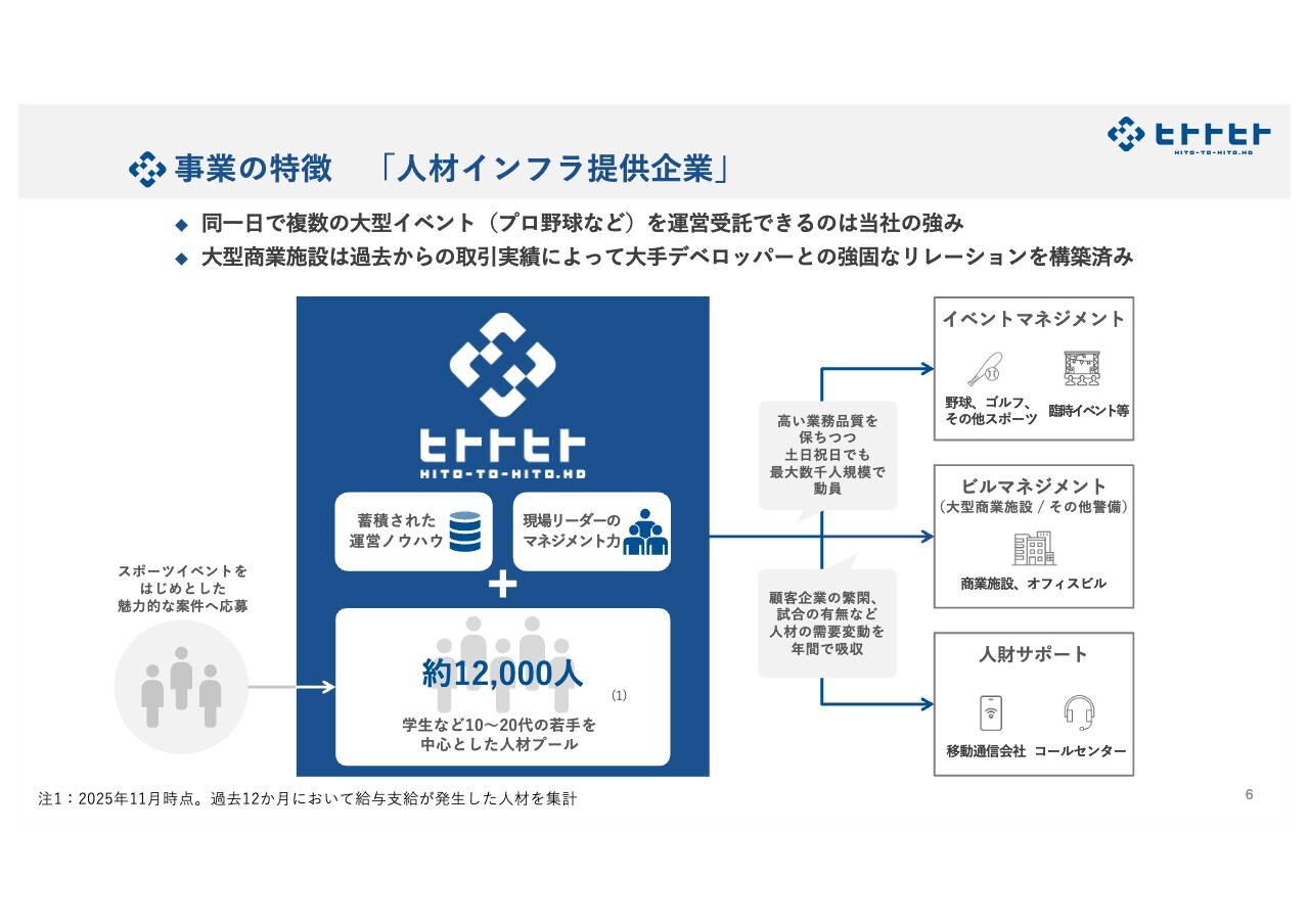 事業の特徴である「人材インフラ提供企業」についてです。先ほどお話ししたとおり、当社は1万2,000名の人材プールを有しています。この人材プールは、同じ場所に同じ人を派遣し続けるのではなく、3つの事業領域にバランスよく配置しています。