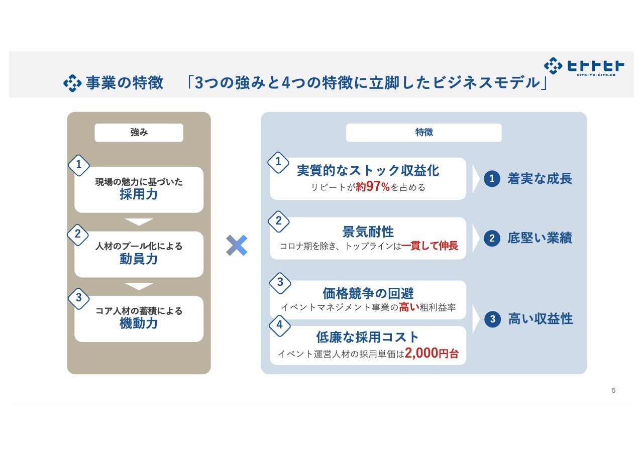 また、コロナ禍には一時的に人の動きが停滞しました。しかし、人が動かないと成り立たない仕事も多く、当社の人材はそのような中でも活動を続けていました。苦しい時期があったものの、最終的にイベントは回復し、会社は赤字になることなく成長を続けています。したがって、当社は景気耐性をある程度備えていると考えています。