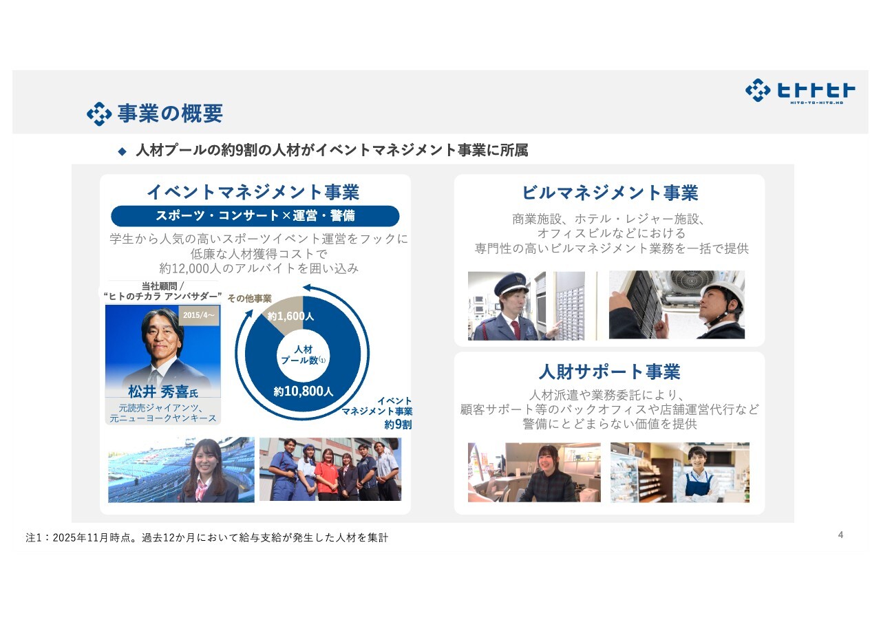 事業内容:スポーツイベントの運営、オフィスビルや商業施設の警備・清掃、企業への人材派遣、および商品・サービス販売支援等の事業を営むグループ会社の経営管理およびこれに付帯する業務