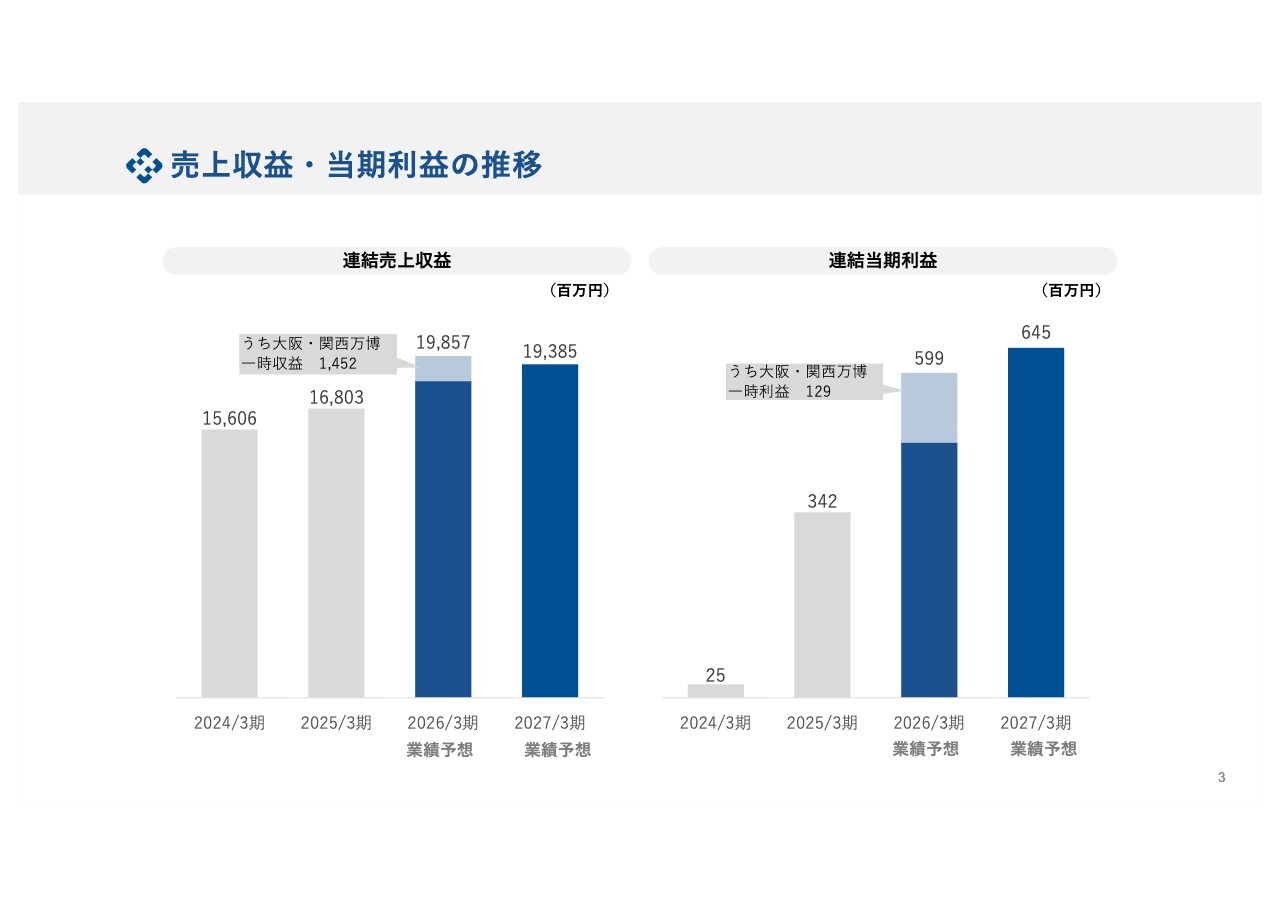 2026年3月期は大阪・関西万博の受注が数多くあり、その売上は14億5,200万円となりました。したがって、進行期である2027年3月期には、これらの売上がすべて剥落する見込みです。