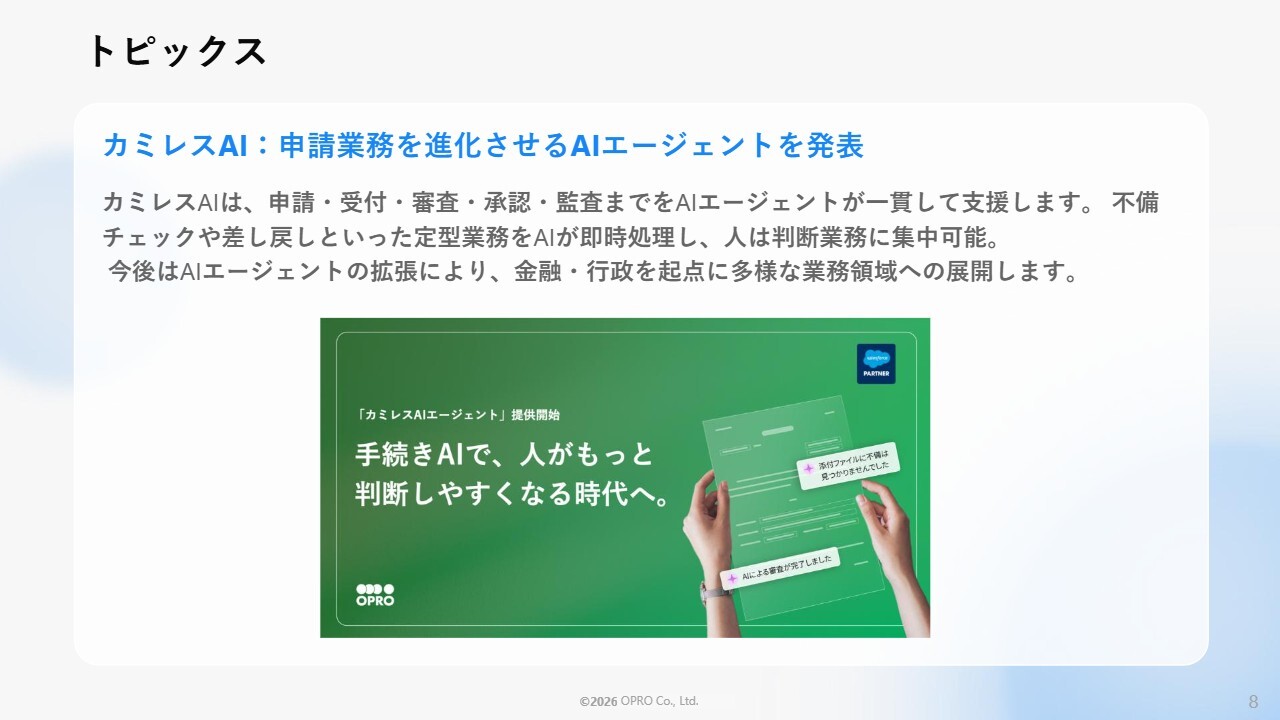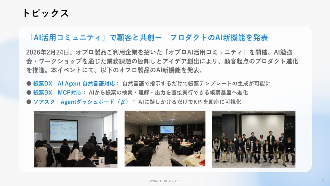 また、AIへの投資を引き続き行い、社内利用にとどまらず、製品開発のAI化を積極的に推進しています。その取り組みの一環として、2026年2月24日に「オプロAI活用コミュニティ」を開催し、既存のお客さまに実際に触れていただく機会を設けました。
