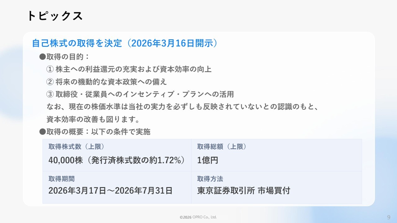 最後に、自己株式の取得を決定しました。スライドには3月16日に開示した情報を記載しています。取得の目的は、1つ目が株主への利益還元の充実および資本効率の向上、2つ目が将来の機動的な資本政策への備え、3つ目が取締役・従業員へのインセンティブ・プランへの活用です。