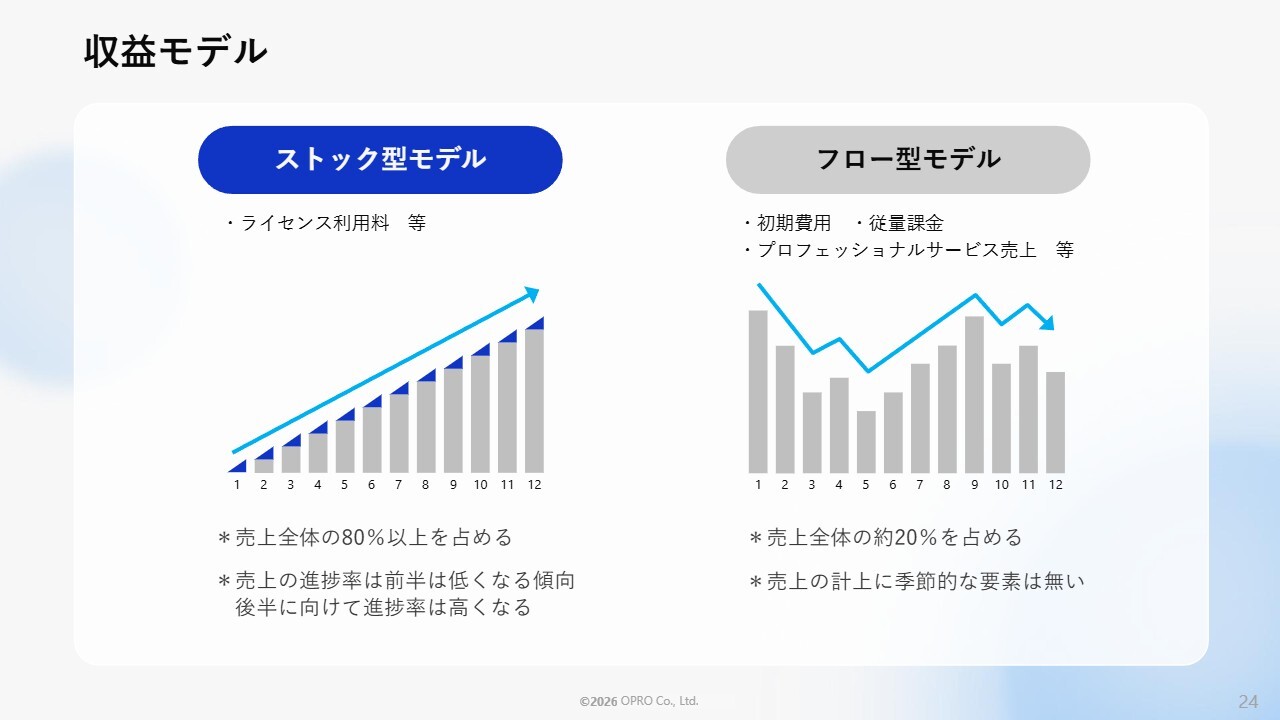 もう1つはフロー型モデルで、こちらはコンサルティングサービスなどのプロフェッショナルサービスの売上です。このモデルでは、その都度売上が計上される構造になっています。しかし、売上計上に季節的な要因はありません。