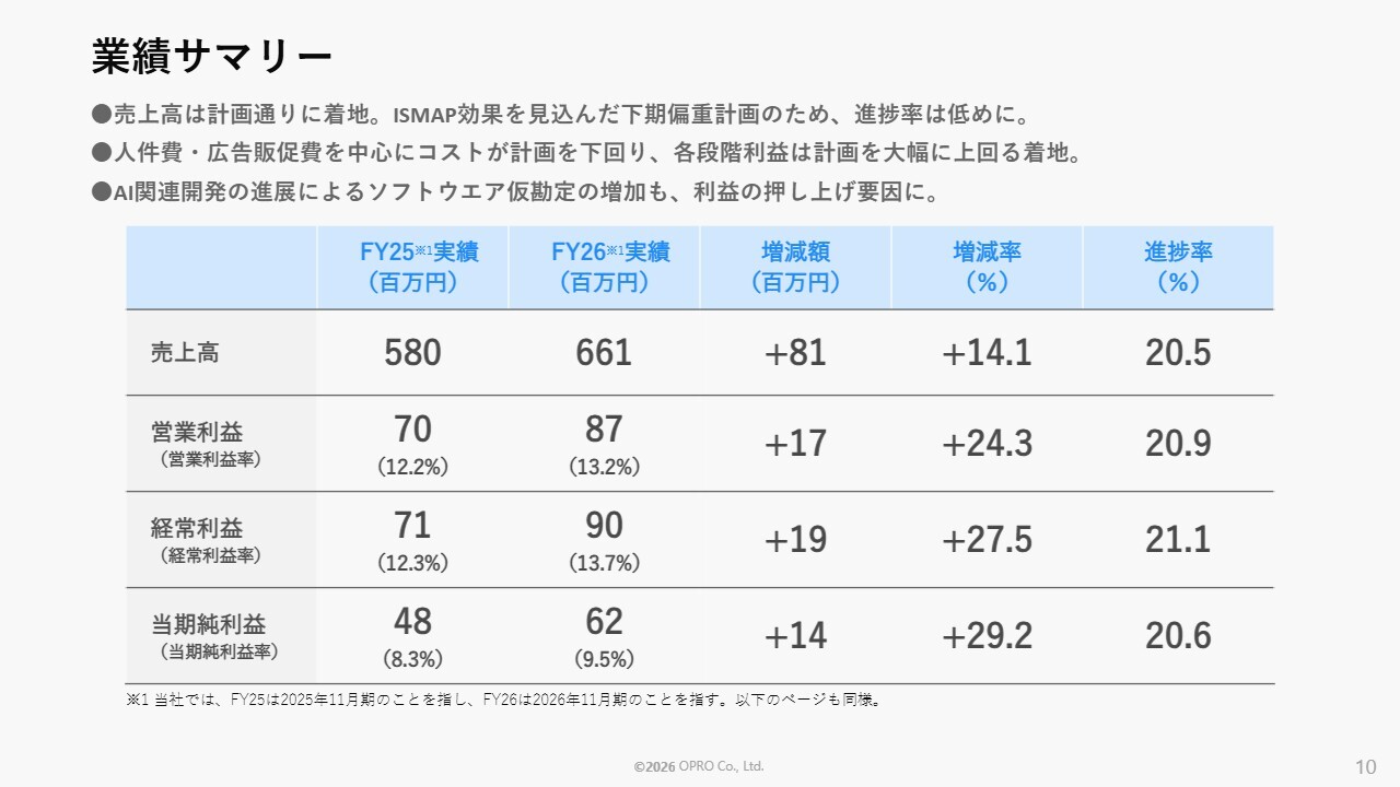 業績サマリーについてご報告します。売上高は計画どおりに着地しました。当社のビジネスモデルはストック型で月次按分のため、後半に進むにつれて進捗率が高くなる傾向があります。今回の進捗率については、計画どおり推移していると考えています。