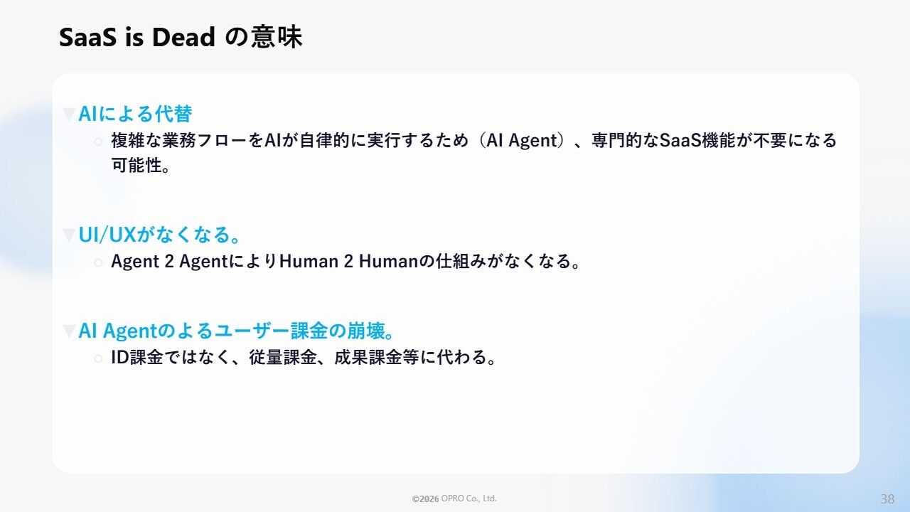 また、AIエージェントが動くということは、つまり人を必要としないということであり、UI/UXが不要になるということです。