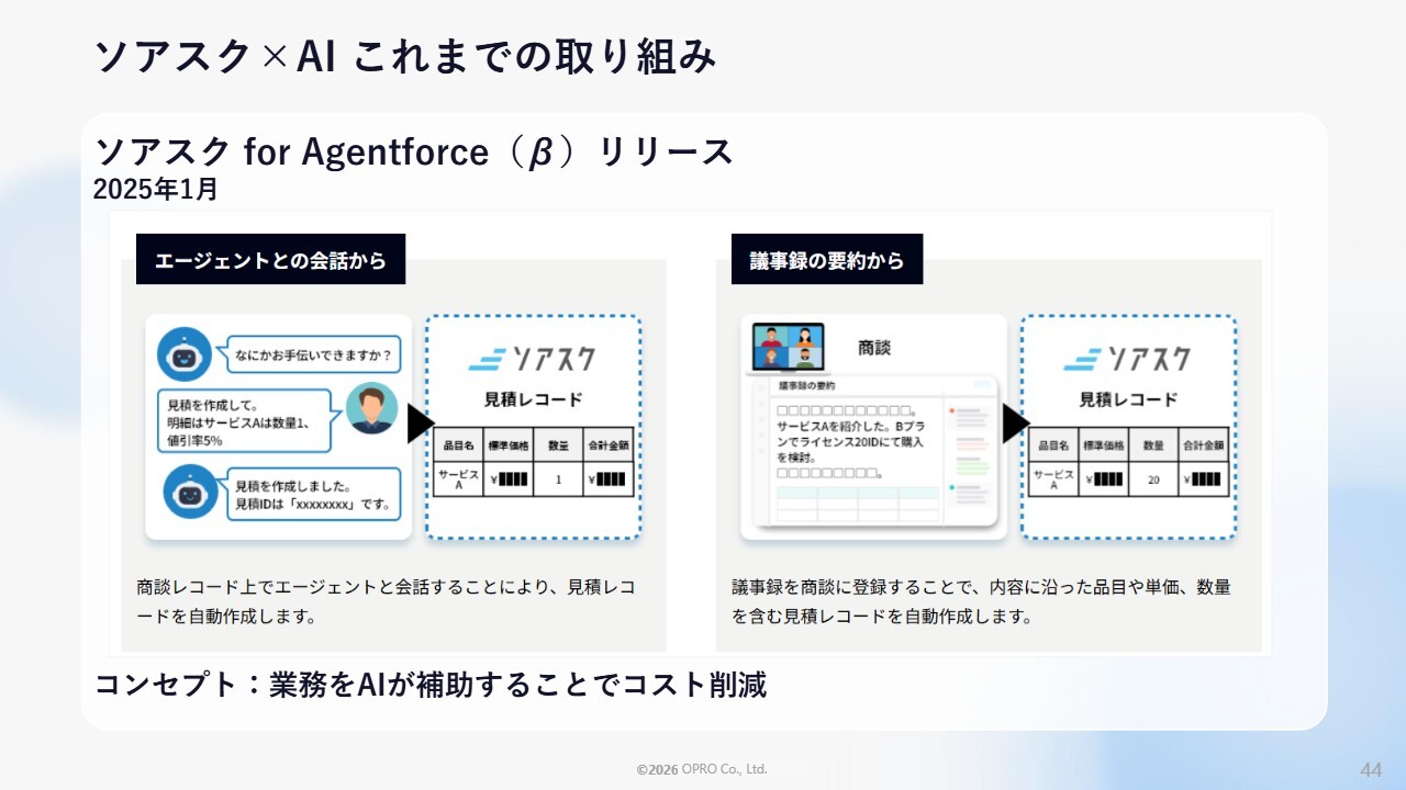 まず「ソアスク Agentダッシュボード」についてご説明します。これまで「Salesforce」の「Agentforce」を活用した製品をリリースしていました。この製品では、例えば商談の会話内容を文字起こしし、その登録された内容を基に自動的に見積もりを作成する機能を実装し、実験的にリリースしています。