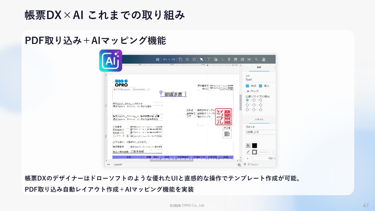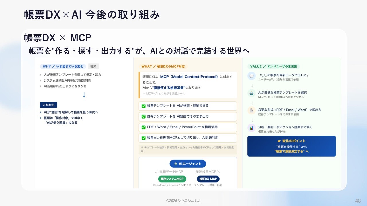 「AI Agent 対応 帳票DX」についてご説明します。これまで取り組んできたのは、PDFを読み込んで自動的に我々の帳票のレイアウトや雛形を作成し、技術的にハードルが高かったデータのマッピング作業をAIで自動的に行うという仕組みを実装することでした。これにより、技術的なハードルを大幅に下げてきました。