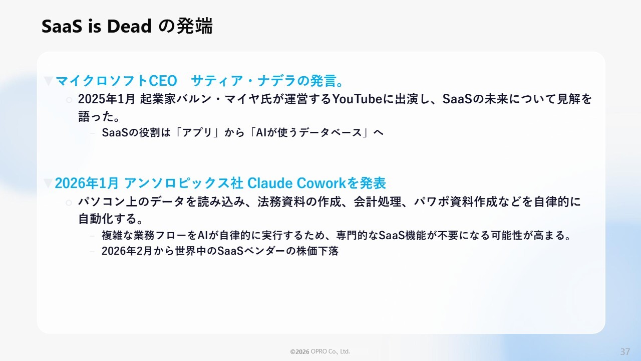 まず、「SaaS is Dead」の発端について説明します。これは昨年1月から始まりました。マイクロソフトCEOのサティア・ナデラ氏が、あるYouTube番組で「SaaS is Dead」という言葉を使用したことがきっかけとされています。