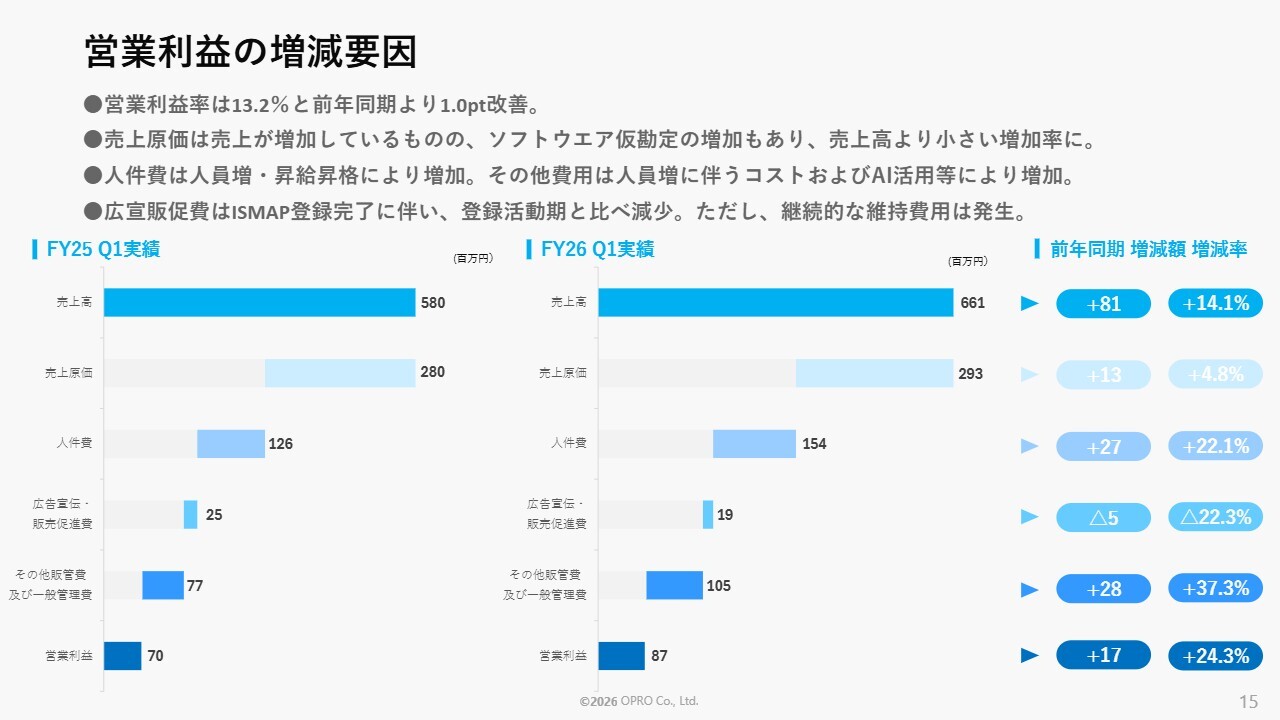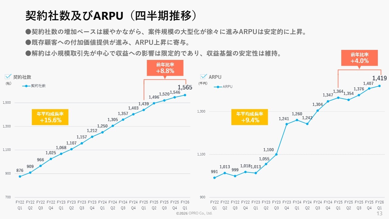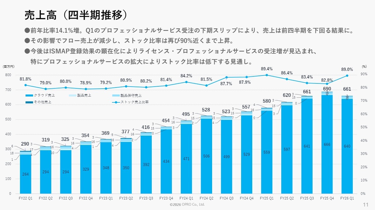サブスクリプションの積み上がりにより、ストック売上の比率が高く、粗利率も安定しています。FY2026第1四半期の営業利益率は13.2パーセントで、前年同期より1.0ポイント改善し、その持続性を示しています。