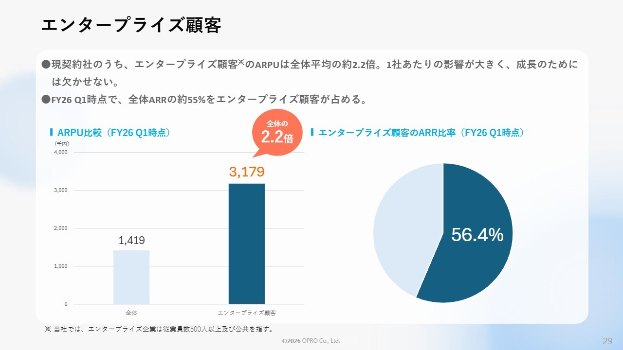 エンタープライズ顧客への投資は非常に重要であると考えています。スライド上の数字をご覧いただくとわかるように、当社の1社あたりの平均ARR(ARPU)は141万9,000円ですが、エンタープライズ顧客に限定すると317万9,000円となり、平均の約2.2倍です。
