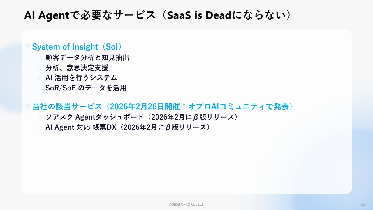 そして、これから私たちが考えているのは、SoIのソリューションです。その一つが、先ほど「オプロAIコミュニティ」で発表した「ソアスク Agentダッシュボード」と、AIエージェント対応の「AI Agent 対応 帳票DX」です。