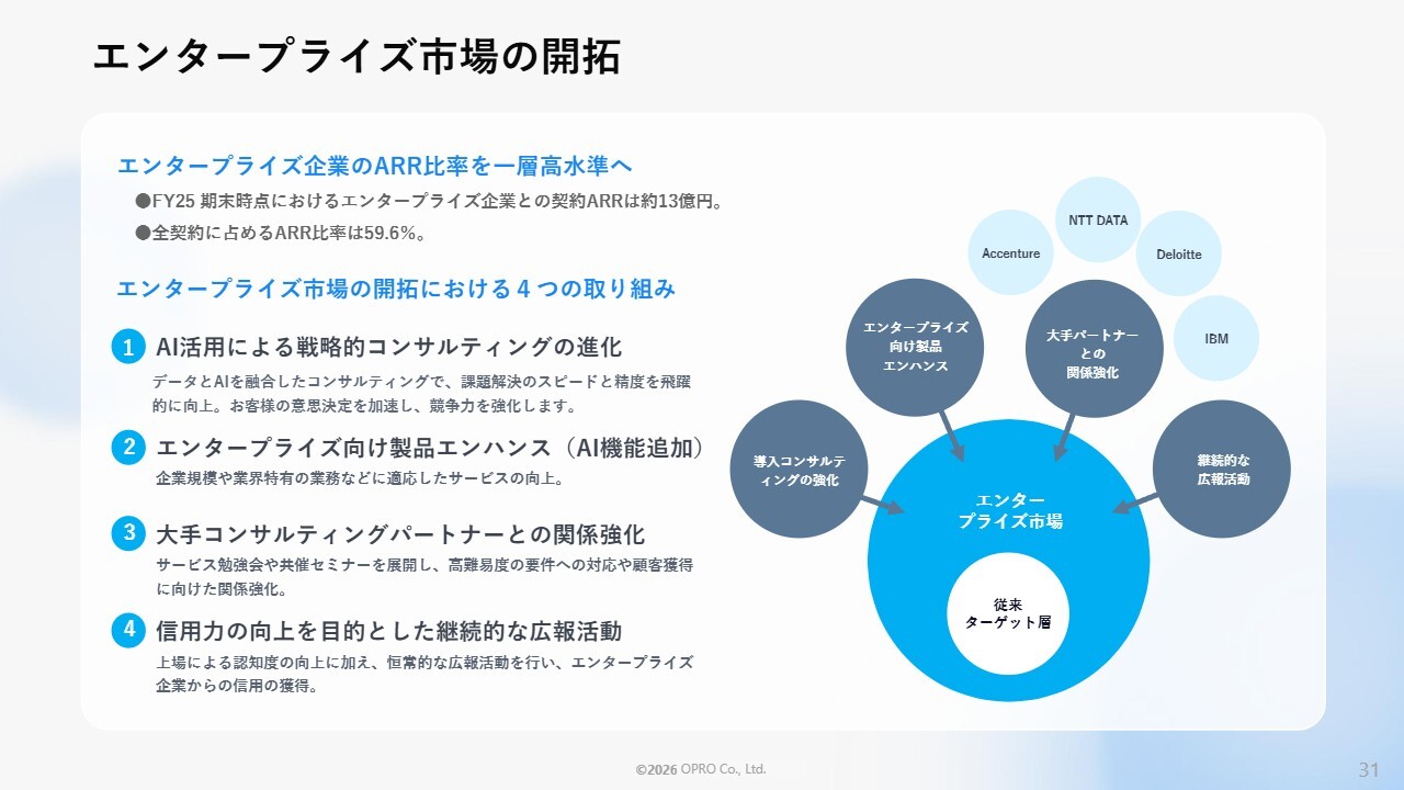 一方で、2億円以上の大型案件、特に10億円前後のものについては、大手コンサルティングパートナーとの関係強化が喫緊の課題であり、最も重要なポイントです。そのため、アクセンチュア、デロイト トーマツ等と連携を強化して取り組んでいきたいと考えています。