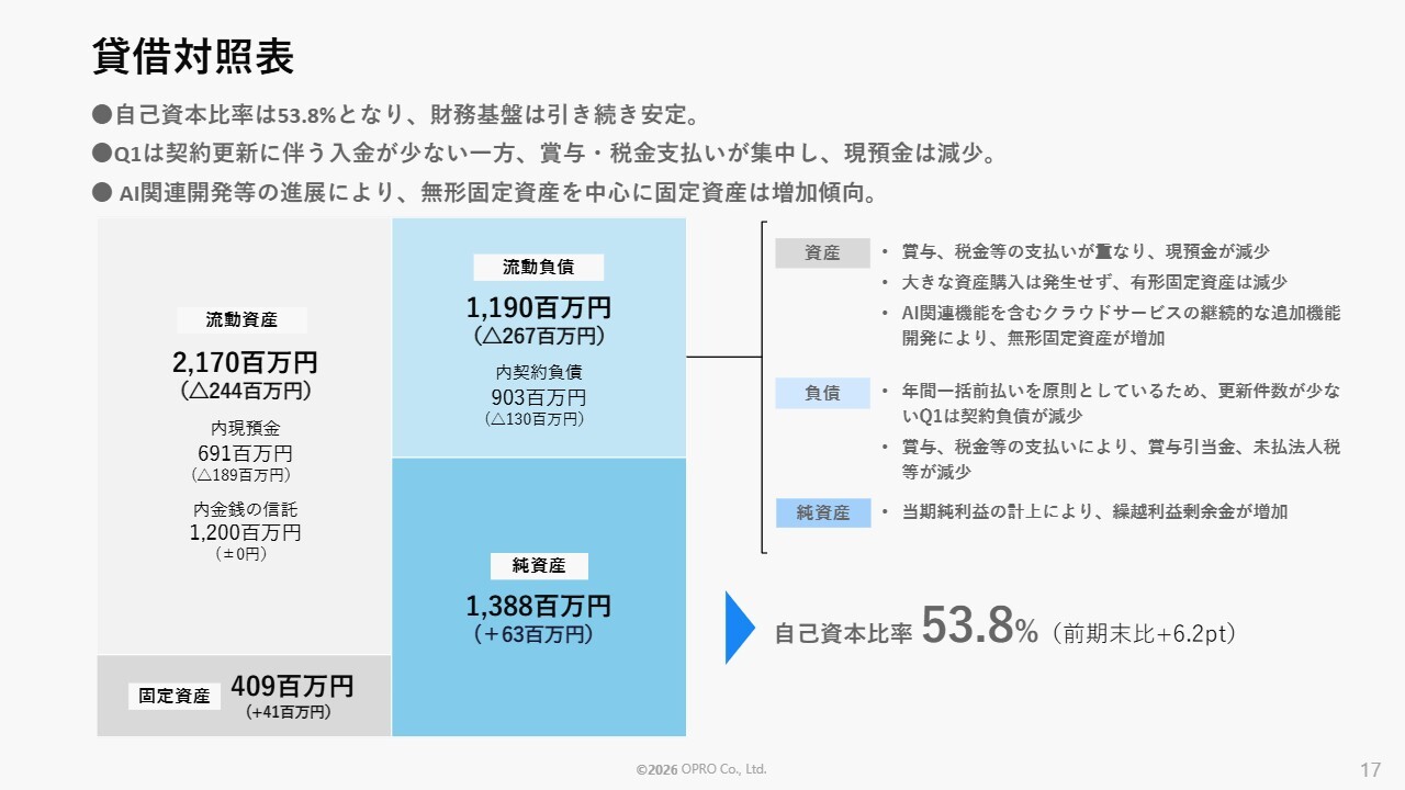 また、AI関連開発などの進展により、無形固定資産を中心に固定資産は増加傾向にあります。契約負債については、年間一括払いを原則としているため、更新件数が少ない第1四半期は契約負債が減少する傾向にあります。